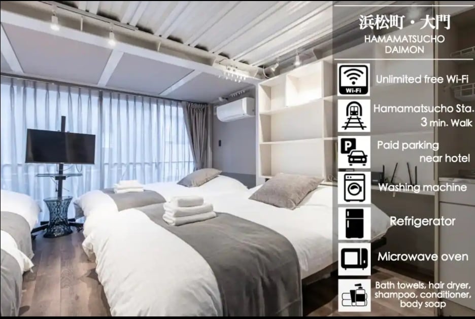 交通便利/最适合搭乘山手线/步行3分钟到达滨松町站,步行5分钟到达大门站/靠近车站的房源/最多可住8人