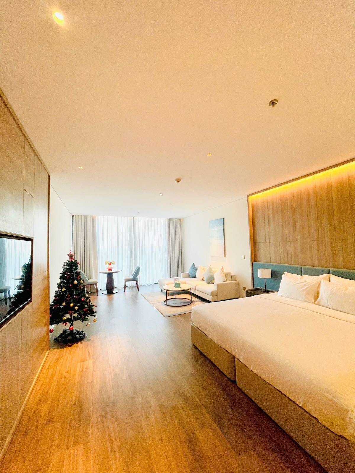 Luxury apartment à la carte Ha Long - the highest 41 floor building in Ha Long, the apartment on the 32nd floor has 2 bedrooms and a living room with glass ocean views, at the foot of the building is a white sand beach, 5-stars standard room facilities are fragrant and clean, suitable for families with young children or groups of friends who want to have a common space when traveling but still need a private, closed bedroom, especially when traveling. Watch the sea 24/24 even lying on your bed