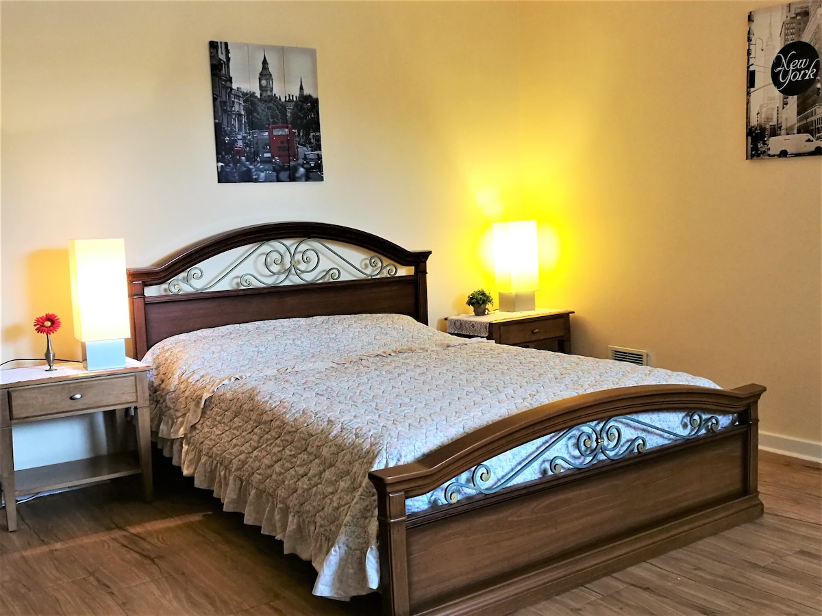F/F 加大双人床卧室,配备标准双人床,地理位置优越