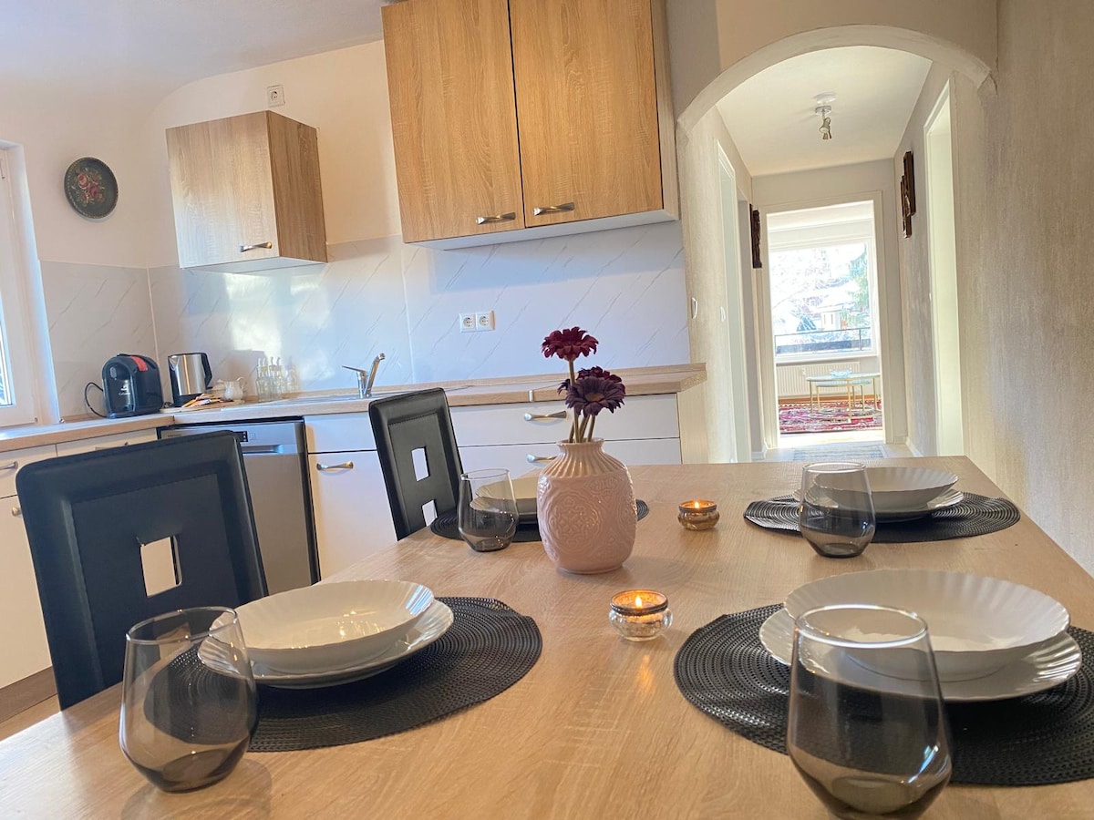 👥 Ideal für Familien bis 4 Personen 🌲 Ruhige Lage am Waldrand 🌳 Großer Garten mit Spielturm, Trampolin & Sandkasten 🔥 Feuerschale für gemütliche Abende im Freien 🍖 Grill zur Nutzung für unsere Gäste 🌄 Balkon mit Panoramablick 🛏️ Schlafzimmer mit King-Size-Bett 🛋️ Schlafcouch für zwei im Wohnzimmer 🚿 Bad mit begehbarer Dusche & Föhn 🍳 Voll ausgestattete Küche 📺 Smart-TV & WLAN 🧺 Waschmaschine 💪 Gratis Fitnessstudio (5 Min entfernt) 🚗 Eigener Parkplatz 🚌 S-Bahn 400 m