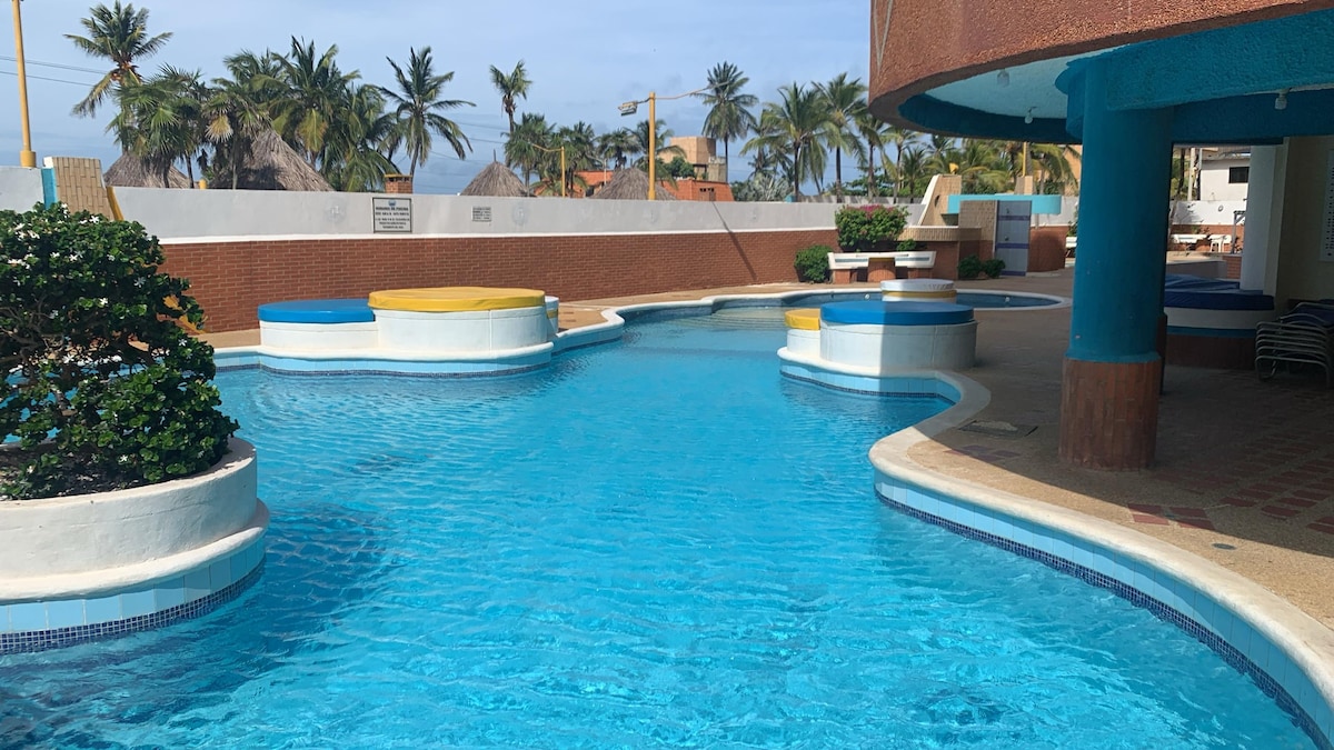 Bienvenidos! Disfrutarás y Descansarás en un Complejo Vacacional. Acceso a playa, isla privada, restaurantes, panadería, bodegones, parrilleros, complejo de piscinas, una de ellas abierta las 24 h, canchas deportivas, sin salir del Complejo Cocina eléctrica full equipada, A/A central, dos TV, agua caliente, vigilancia las 24 h, estacionamiento gratis Pozo de agua, planta eléctrica áreas comunes