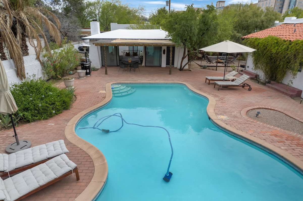 A Elegant Desert Retreat near UofA main gate square and Downtown with fast Wi-Fi, private parking space, a clean relaxing layout ideal for short or extended stays. Enjoy a comfortable king suite and Queen suite. Fully stocked kitchen and coffee bar, and a quiet workspace in each room. The front porch sitting area offers a relaxing spot with a firepit, after a busy day. Minutes to Saguaro National Park, Dining, Cafés, Banner Hospital, and Gem Show venues. Self-check-in and pet-friendly.