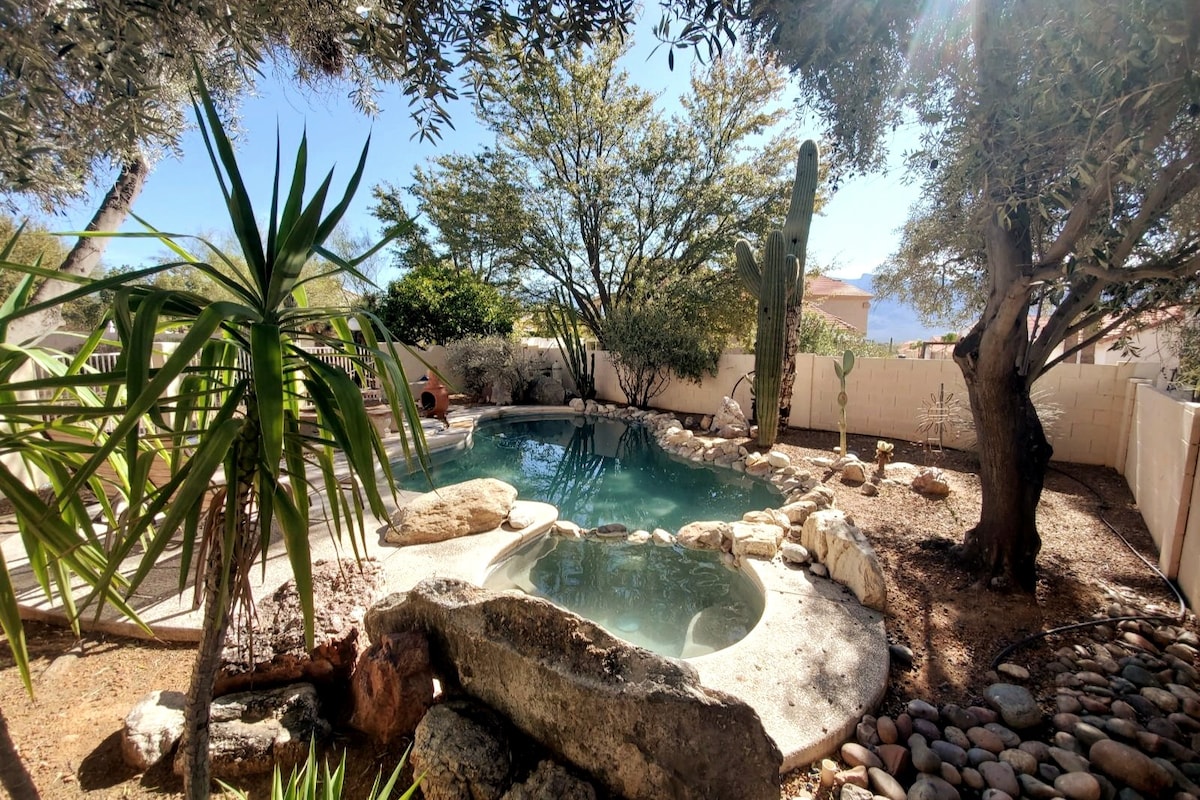 Big comfortable home with lots of light & personality. Heated Pool & spa (extra) all the comforts of home. Master suite features Jacuzzi tub, deck, & futon in the sitting room. Dining options include outdoors to watch the sunrise over the Catalina Mountains. Relax after adventuring in front of the big screen smart TV, enjoy provided games, videos or books, go for a late night swim, or sit around the fire pit & enjoy the stars, away from city lights. No unauthorized parties. Not a party rental!