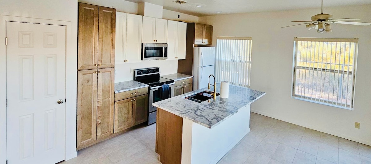 Stay for a short time or extended visit. Nestled in the upper west foothills of Tucson, this fully furnished and peaceful guest house beckons. 2 full bathrooms, spacious and fully functional kitchen, large master suite with 2 queen sized beds… minutes from I-10 and Grant road…. This country space is fully finished and ready for your enjoyment. Central ac and dual paned windows with sweeping view of Tucson and the mountains. Ready for you relaxing stay