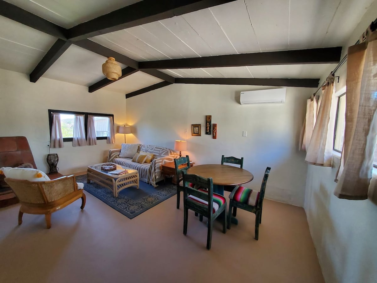 Bright, charming, pool-side, attached guest house with private entrance. The home features exposed brick walls, large windows, authentic Saltillo tile floors, and tasteful midcentury modern furnishing and décor throughout. It comes with all the amenities to make your stay comfortable: a dine-in kitchenette, private bathroom, covered parking, laundry room, Hayneedle king-sized bed (plus a couch bed in the living room), 40” TV, and plenty of space to spread out and make yourself at home.