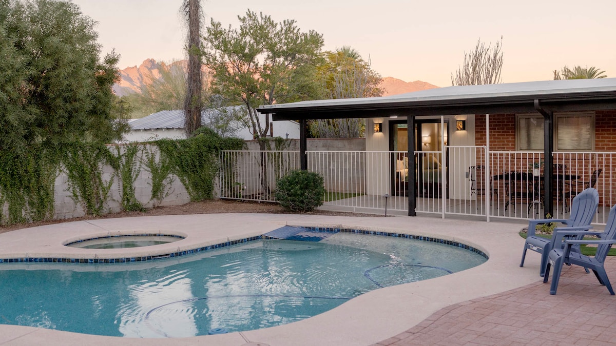 Welcome to Blenman Elm Retreat — a luxury escape in Tucson’s historic neighborhood with stunning Catalina Mountain views, a heated pool, and incredible outdoor spaces. Perfect for families, groups, or travelers seeking relaxation and fun. 🌊Private pool with safety fence (heating available!) 👾Game room + basketball hoop + treehouse with slide 📍 Steps from the iconic Arizona Inn and top dining spots 🔥 Fireplace, outdoor kitchen, bar, and cozy pavilion 🐾 Pet-friendly (additional fee applies)