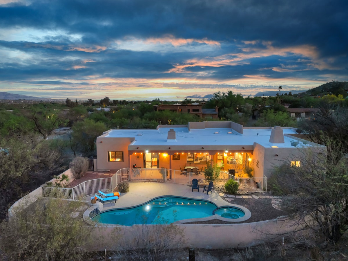 Welcome to a refined desert retreat with sweeping views, a private pool, and a full game room—ideal for elevated group stays. The spacious layout offers multiple living areas and seamless indoor-outdoor flow, perfect for gathering without feeling crowded. Enjoy mornings with desert views, sun-filled afternoons by the pool, and relaxed evenings in the game room. Designed for comfort, connection, and memorable Tucson getaways.