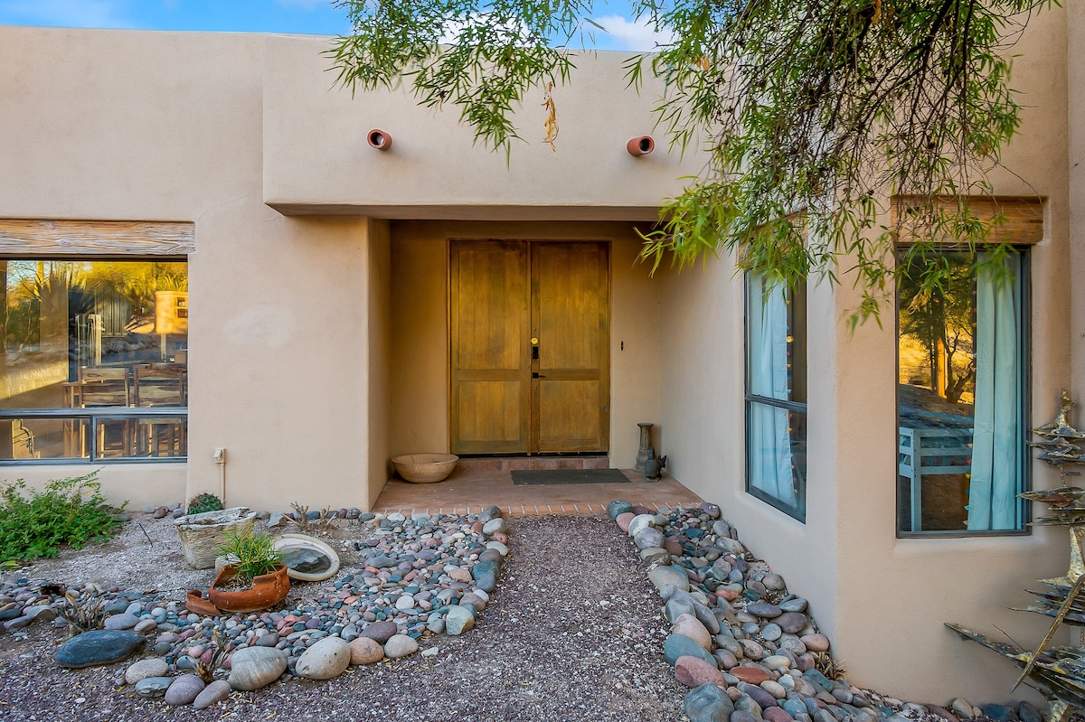 Relax in our family's private resort in Tucson's lush Tanque Verde Valley. Minutes to restaurants and shopping yet nestled in the foothills, near the best hiking and biking around. Our upscale home sits on an acre+ of land, green with mesquite trees and towering saguaros. It's been remodeled with warm and modern detail, while maintaining its Tucson hacienda charm. Full kitchen, updated appliances, spa/Jacuzzi and sparkling pool (pool heat extra), propane grill, cabana and firepit. Sleeps 9