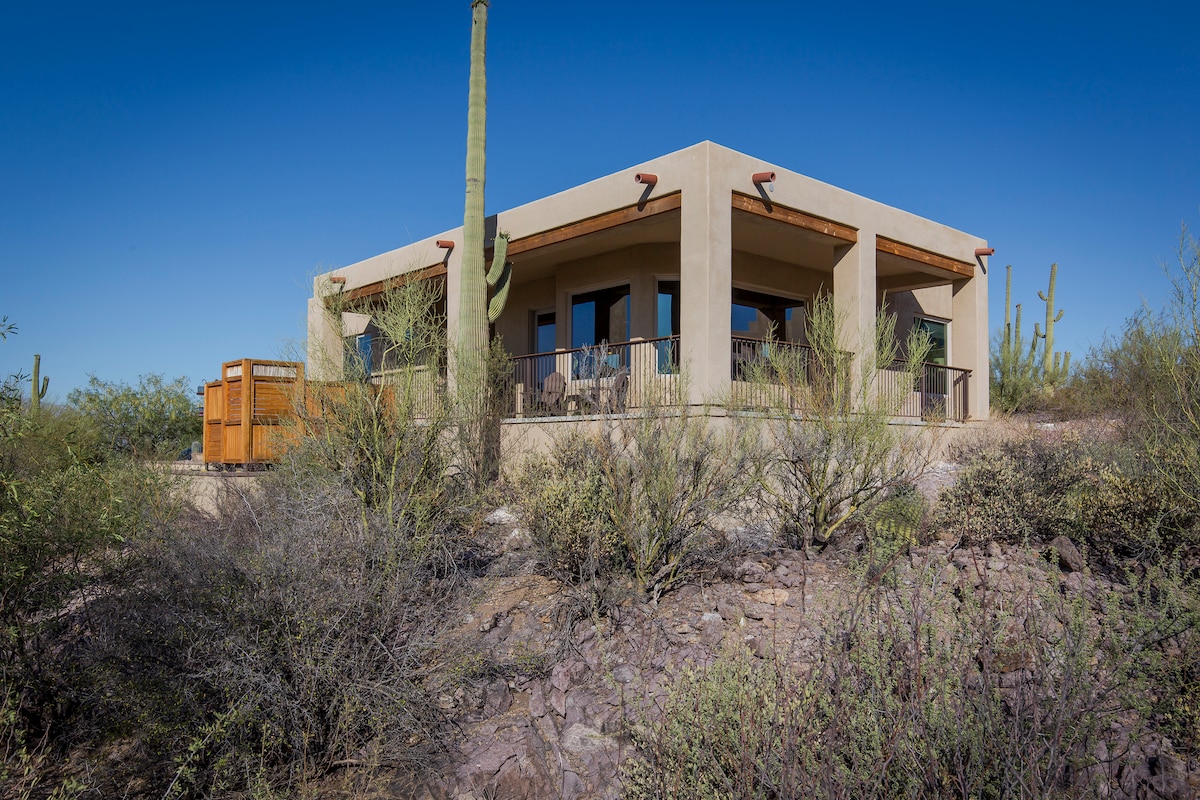 A charming getaway casita with stunning views of the majestic Saguaro National Park and the Picture Rock Mountains for spectacular sunsets. The 5-acre site is home to many varieties of cacti, including giant saguaros and other native plants and trees. Through the casita's panoramic windows, you can observe desert vegetation, birds, rabbits, coyotes, bobcats, javelinas, and deer. An evening bath in the jacuzzi under the starry sky will certainly remain in your memory for a long time.