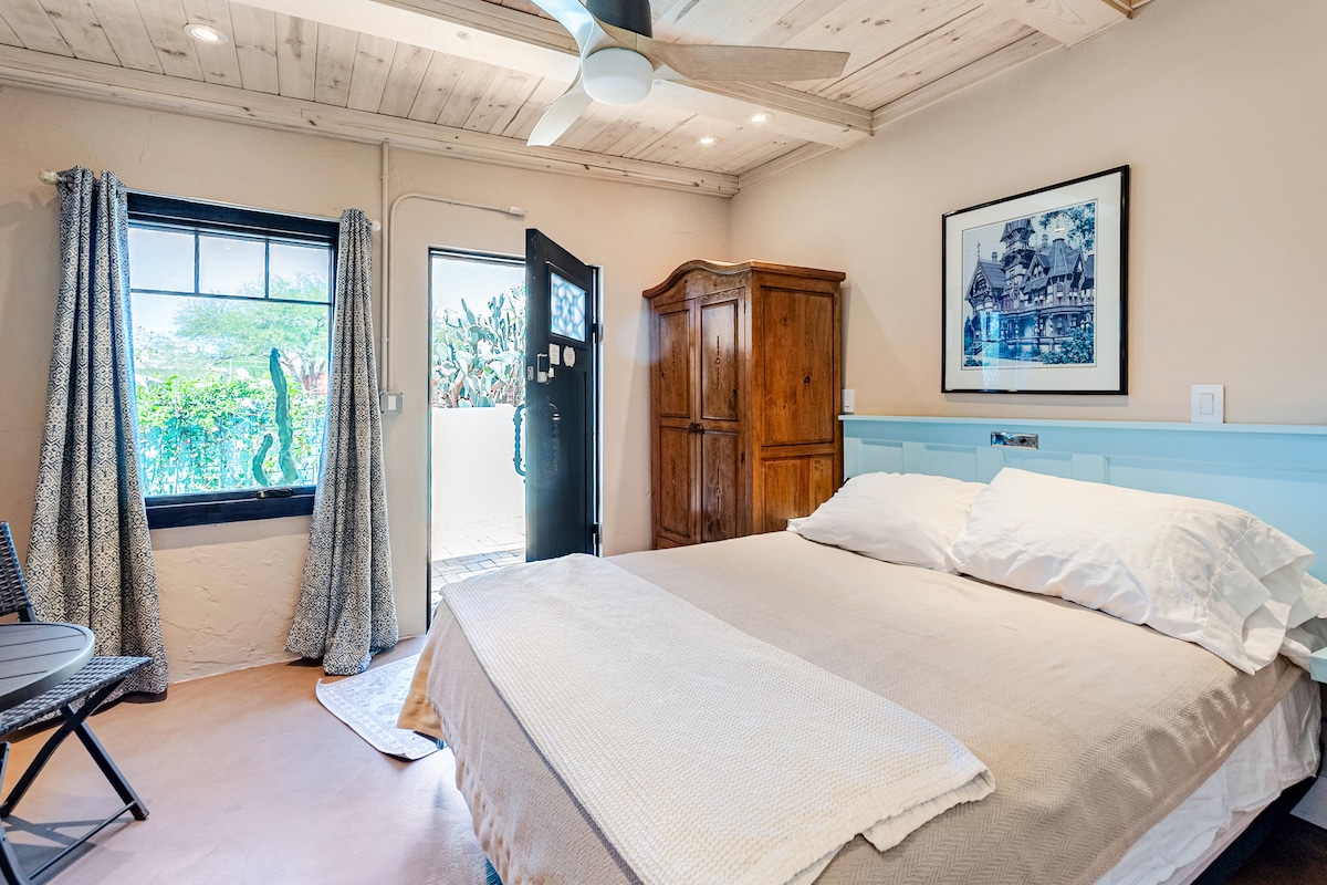 This studio is spacious & comfortable. It is detached, secluded, on a quiet street, ample street parking and completely fenced in. The yard has a ramada with a table, chairs, string lights and a chiminea Inside, you’ll love the exposed adobe, skylight, and wood beam ceilings. The fully stocked kitchen is updated, with full size appliances. In the heart of Armory Park, it is close to 5-points, downtown, historic 4th Ave and Uof A. Ask me for dining, hiking, shopping and day trip recs!