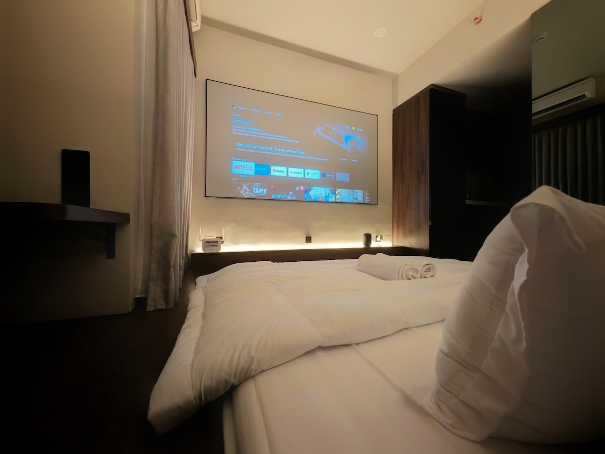 Welcome to The Reserve – Cinematic Studio, a retreat crafted for comfort and entertainment. Unwind on a sunken king-sized Belgium-imported latex bed while enjoying a 100” cinematic Google TV projector paired with a Google Nest speaker. Set the mood with dimmable ambient lighting, work productively at the dedicated floor desk, and refresh in the stylish wooden-tile bathroom. A sleek kitchen completes this modern, serene escape.