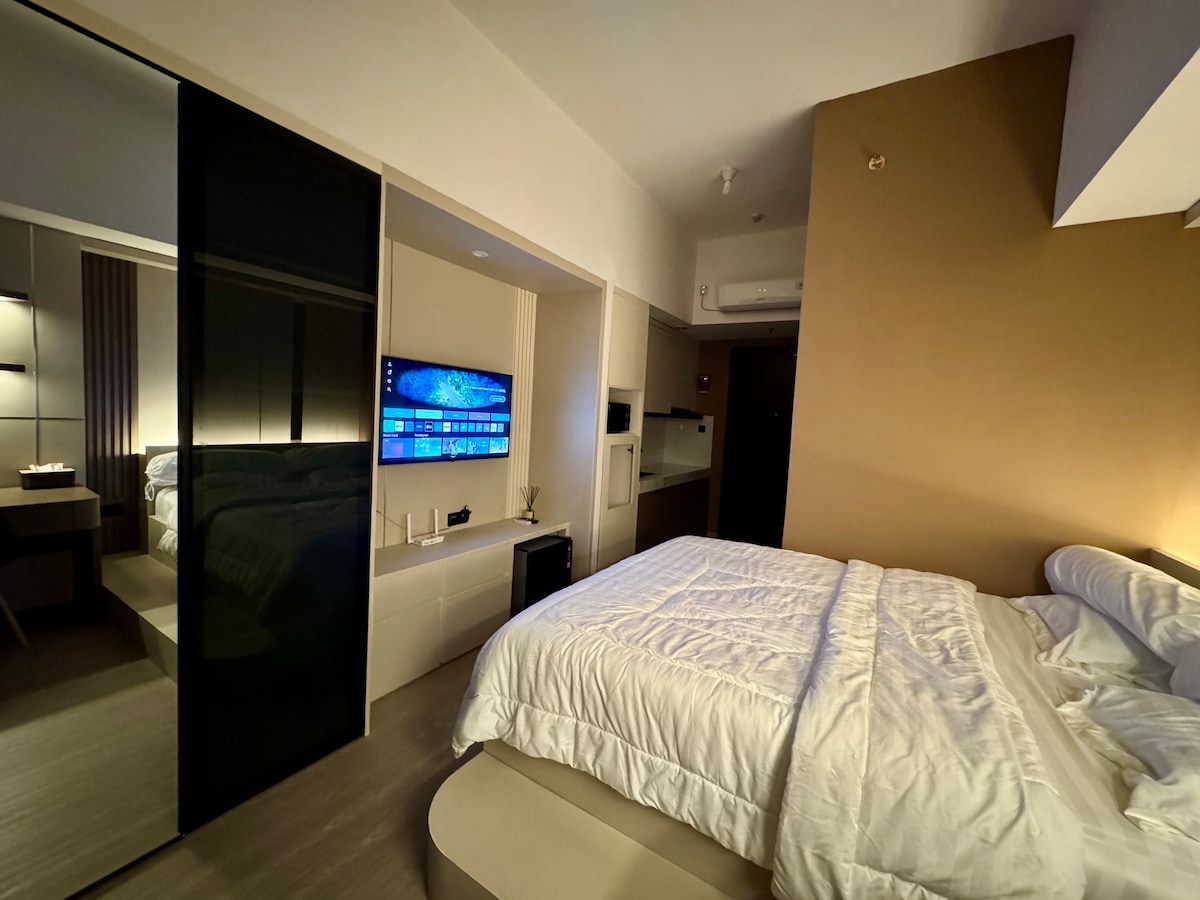 BRAND NEW & Modern interior, equipped with vinyl wooden floor and warm droplights. The unit is equipped with a sofa, 40" SMART ANDROID TV, working desk and smart strip, it’s own bathroom, a queen-sized bed, a spacious wardrobe cabinet, and a balcony that overlooks the city. Kitchen basic utensils are also provided for LIGHT cooking. The unit is also surrounded by tons of facilities for better quality life (swimming pool, thematic garden, children playground, & skybridge access to mall SMS).