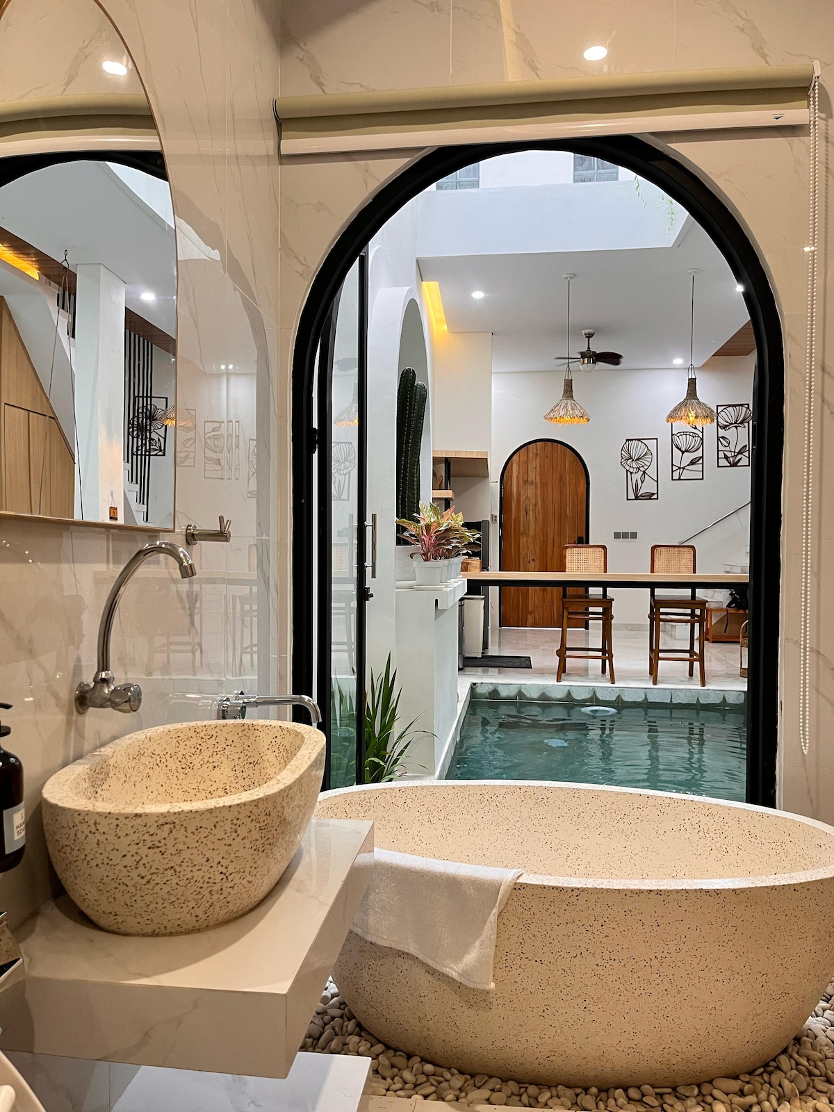 This villa is located in the popular Prawirotaman area—one of Yogyakarta’s favorite spots among international tourists. It features a private pool and a relaxing bathtub, offering a homey and comfortable stay. There’s also a kids activities area, making it perfect for family getaways. Surrounded by cafés, art galleries, and cultural attractions, it combines the best of vibrant local life and peaceful retreat.