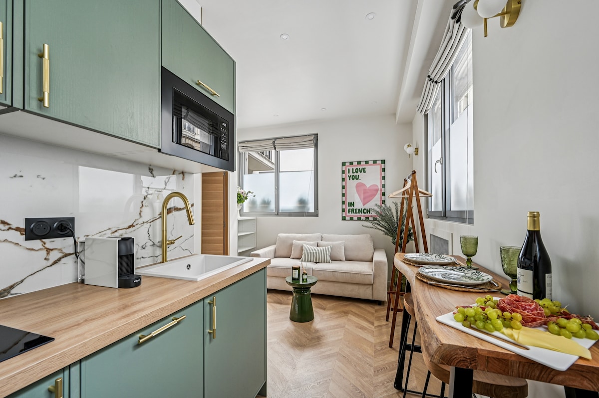 This charming large one-bedroom apartment in Pigalle/Rochechouart features a bright living room with original wooden floors, a fireplace, a comfy sofa bed and a double balcony that is perfect for morning croissants from the bakery below. The kitchen is well-equipped, and the bathroom includes a bathtub and rain shower. Located near Rue des Martyrs, Sacré-Cœur, and local cafes, it's literally steps away from supermarkets, a park, specialty coffee and Friday's Local Produce market at Anvers Square