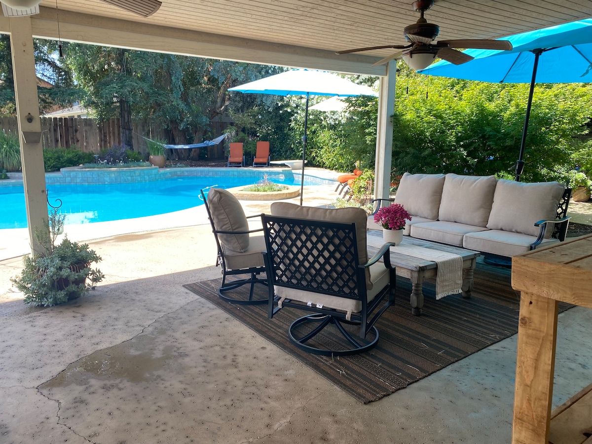 The Iris House is located close to downtown Visalia’s shops, restaurants, breweries & the Convention Center. A 40 min. drive to Sequoia National Park, 30 min. to Three Rivers , 45 min. to Fresno and 2.5 hrs. to Yosemite.House has 3 bedrooms, 2 baths, a family room w/fireplace, living room, laundry room, equipped kitchen, dining area, gated pool, a landscaped backyard, Koi pond, BBQ, fire-pit, basketball & lounging areas. It’s a quiet neighborhood. No parties.Smoking permitted in backyard only.