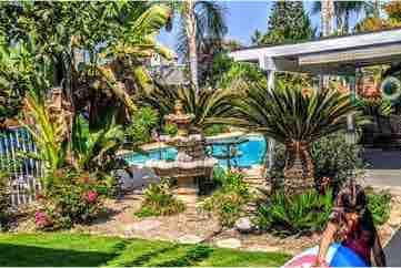 We offer private entrance to the suite consisting of 1 bedroom w/ full bathroom Bathroom is shared by your group You enter thru common room with sofa sleeper bed. there’s a folding card table and chairs, 1/2 kitchen No oven or stove. Also two chairs and table just outside to enjoy the garden. We live in a & safe up scale established neighborhood. Watch humming birds bath in our fountain, enjoy large garden and covered patio, enjoy use of our pool stores and dining close by.