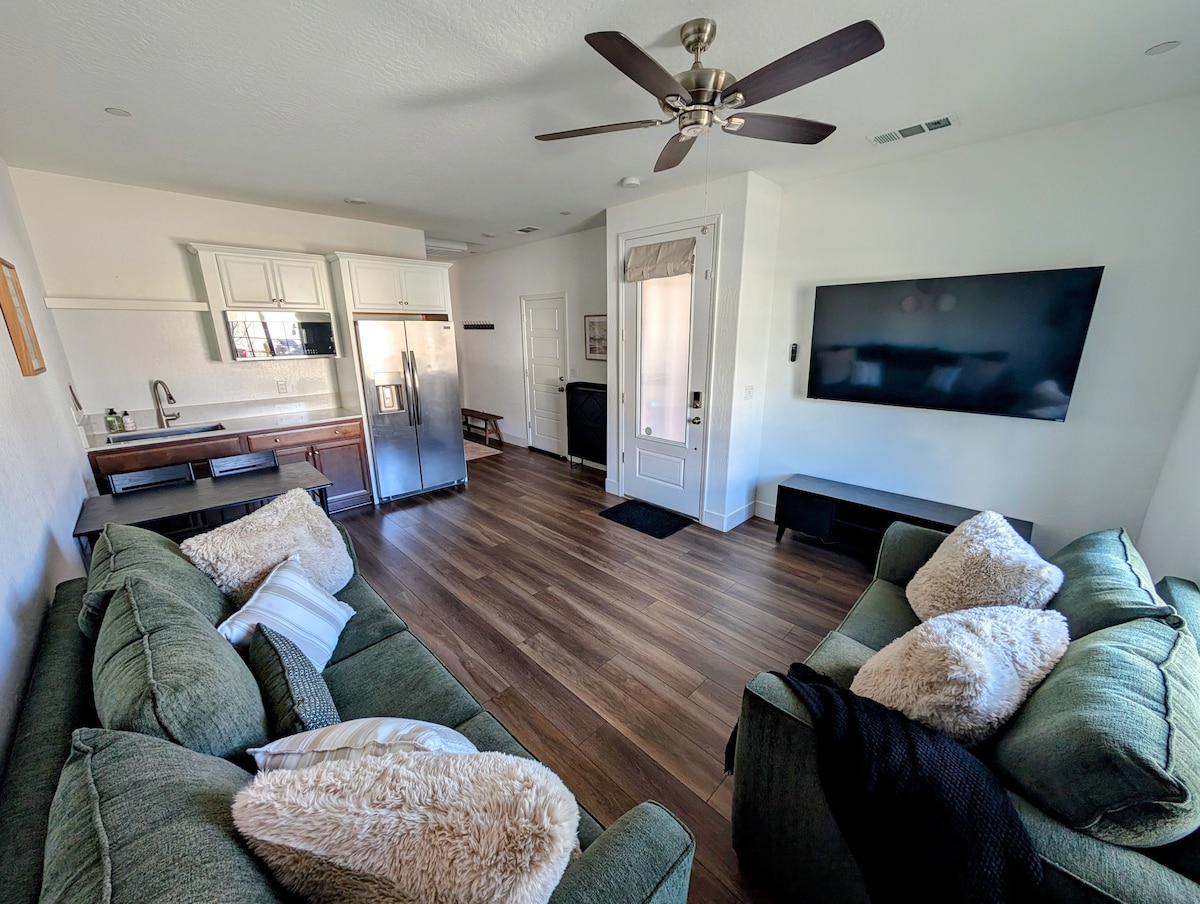 Stay at our modern guest suite in Visalia, just 40 minutes from Sequoia National Park entrance and blocks from downtown. Accommodates up to 3 guests—ideal for small families, couples, or solo travelers. Features a king-size bed, optional rollaway single bed (upon request) ideal for children or smaller adults, cozy living area, kitchenette, dedicated workspace with high-speed Wi-Fi, and walk-in shower. In a safe neighborhood near a scenic park with trails—perfect base for Sequoia adventures.