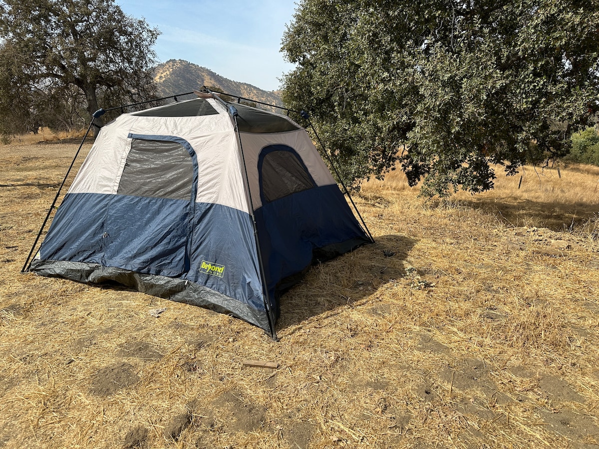 Enjoy nature in this spacious Tent with some of the comforts of home. This tent is the second in our small campground. It comes with two double beds, night stand, pillows, linens, bath towels, cooking utensils, lanterns, fire pit, gas barbecue, large table and drinking water. We have one vault toilet, an indoor and a outdoor shower that are shared with the other campsites. We also have a restaurant and Candy/Ice Cream shop walking distance away. We are 4.5 miles from the Sequoia National Park.