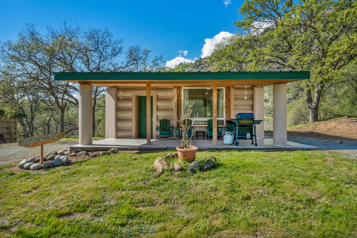 You're Glamping!🌲Enjoy this ARTSY wood cabin tucked away on top of a private mountain road in the Sierra Nevada overlooking the Kaweah River & Sequoia Nat’l Park. A one-of-a-kind getaway experience—beautiful views & a path that leads to a private beach & swimming holes. Kitchenette: mini-fridge, microwave, French Press coffee, cutlery et al. BBQ grill is right outside your door. 🍔🌭🥩🍗 Outdoor shower! is HOT year-round & your private bathroom is a short 5-min. walk away. See you soon!