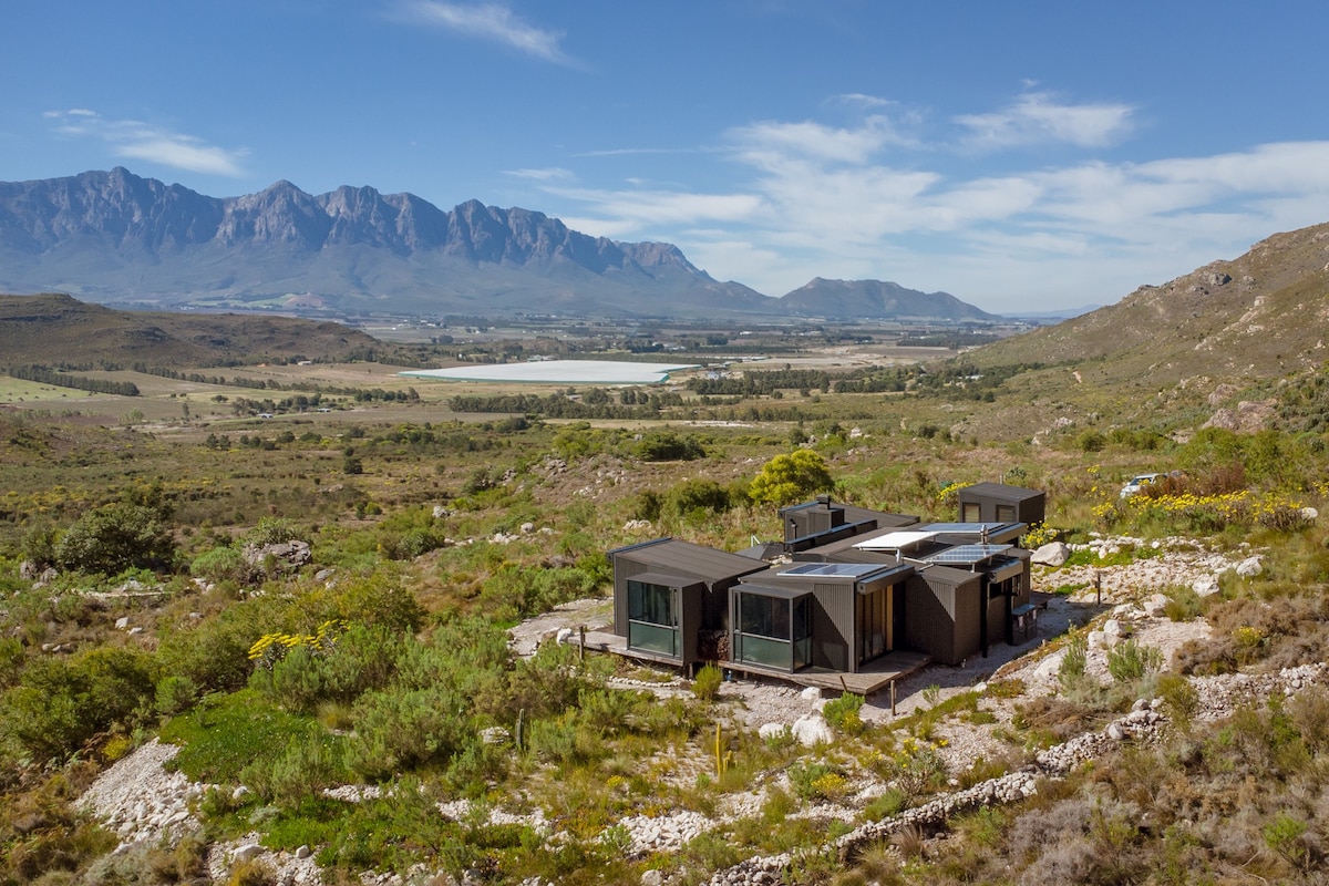 Enjoy the sights and sounds of nature when you stay in this unique eco home, designed with biophilic principles. We’ve chosen natural building materials like hemp walls, 100 year old recycled Oregon wood and handmade eco-paint to increase our connectivity to nature & tread lighter on our planet. Double glazed glass helps regulate. Overlooking our farm dam, with trees to rest under and the majestic Winterhoek mountains as a picturesque backdrop - our cottage is the perfect weekend getaway.