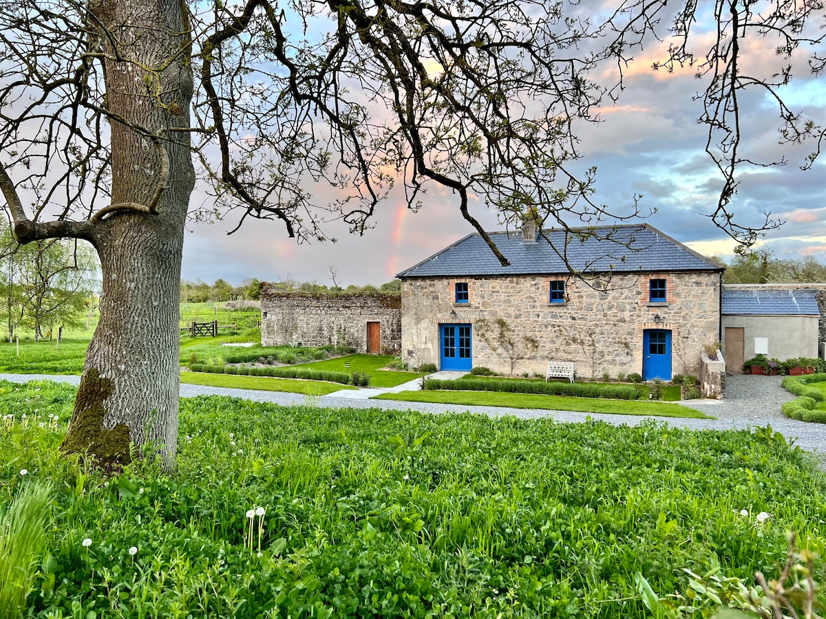 “The Barn” is a beautifully restored 19th century building beside our Farm house, finely furnished for your comfort. Enjoy an Emperor size, bed dressed in luxury cottons. Although “The Barn” is private I'm always on hand. Nestled snugly on our farm at the end of a country lane, surrounded by gardens & lush countryside. Walk the towpaths of Borris, venture up Mt Leinster, enjoy the quaint pubs of Clonegal. Kilkenny City is a must.