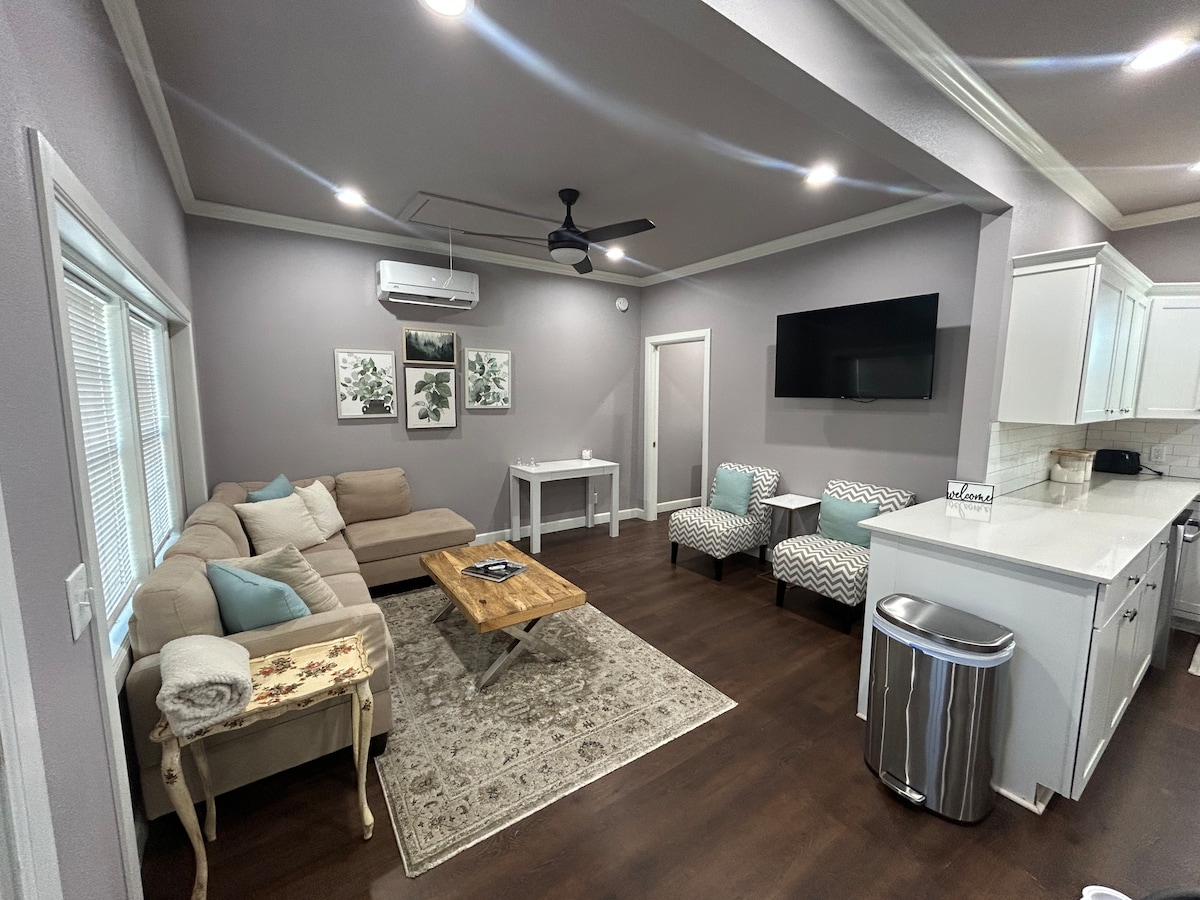 Historic carriage house converted into a tiny guest home, complete with everything needed for your stay. Full kitchen, washer and dryer, updated bathroom, quality mattress and entertainment center in a cozy space right next to downtown entertainment district. The historic Owen Park neighborhood is conveniently located within minutes of night life, restaurants, business, Gathering Place and Tulsa River Parks. The guest house is located at the back of a family home.