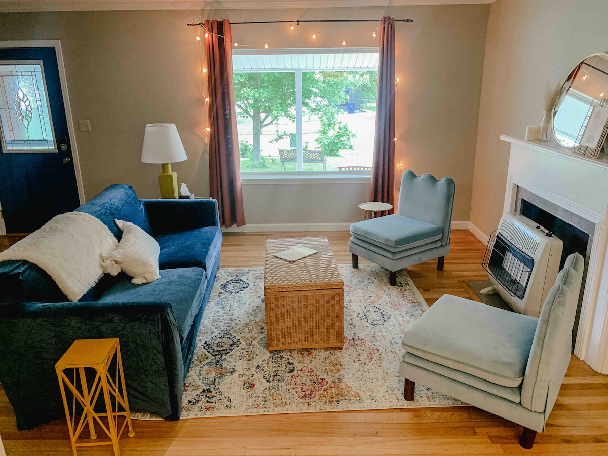 A few houses from Midtown’s pickle ball courts, you’ll find the Ivy Cottage. Charm and character are the highlight of this adorable property. The oversized sectional is the perfect place to cozy up and watch your favorite show on the Smart TV. Or serve dinner in the dining room with French doors that open to the patio. In the back you’ll find a hot tub, smart TV, couch, dart board, wine fridge, cornhole, etc. Plush beds await when you’re ready to call it a night. *Fireplace is not working.