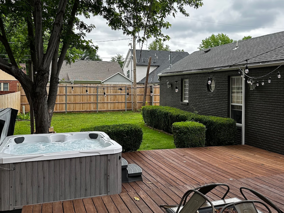 Settle into this beautiful, spacious home after a busy day exploring all the city has to offer with a dip in the hot tub on the beautiful deck with privacy blinds, fans, and outdoor string lights, or take a stroll down the award-winning Main Street of Broken Arrow--The Rose District (Walking distance from the home) and enjoy great shopping, excellent dining, and entertainment! ~Brand new everything with down goose feather comforters and pillows~