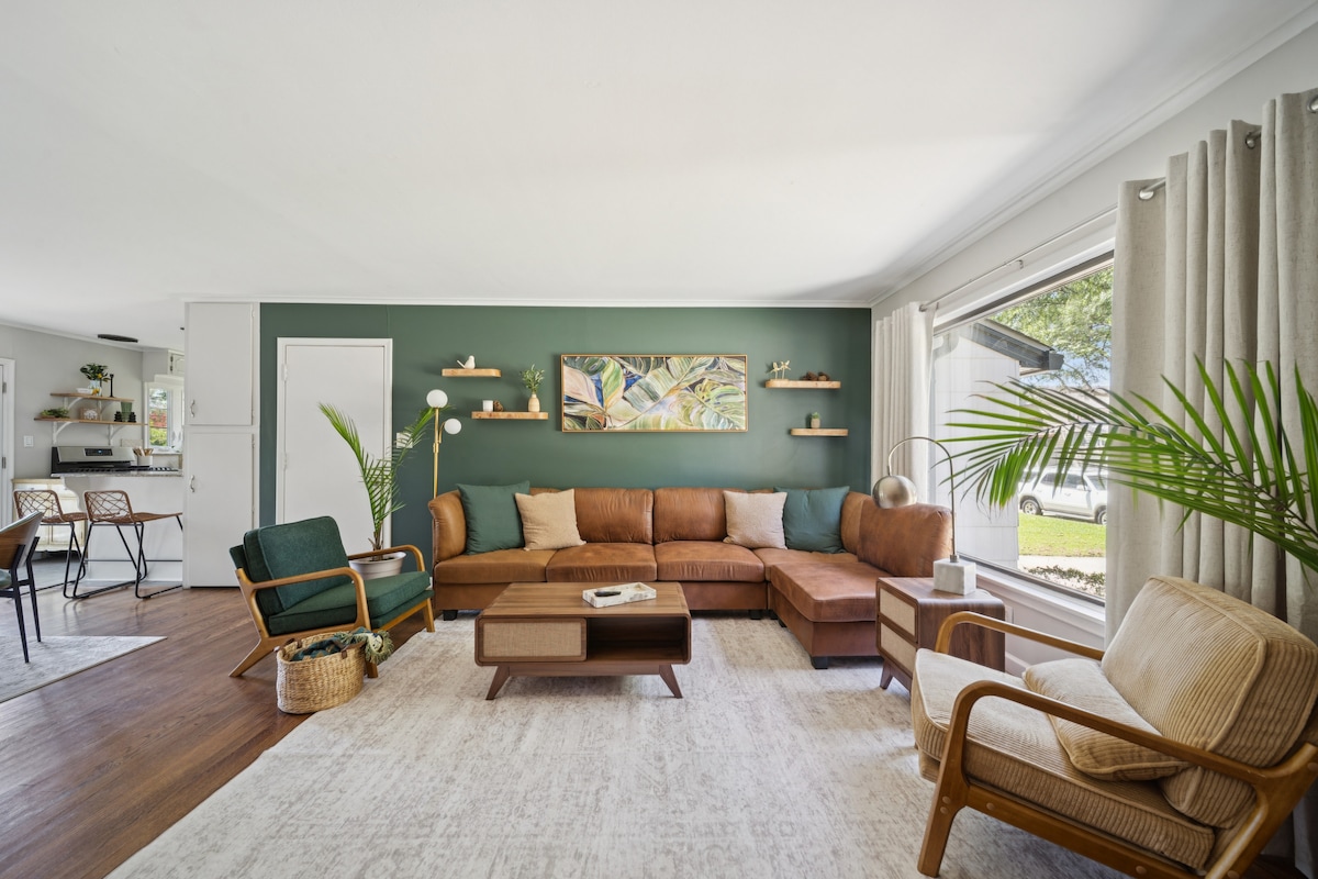 A few houses from Midtown’s pickle ball courts, you’ll find the Ivy Cottage. Charm and character are the highlight of this adorable property. The oversized sectional is the perfect place to cozy up and watch your favorite show on the Smart TV. Or serve dinner in the dining room with French doors that open to the patio. In the back you’ll find a hot tub, smart TV, couch, dart board, wine fridge, cornhole, etc. Plush beds await when you’re ready to call it a night. *Fireplace is not working.