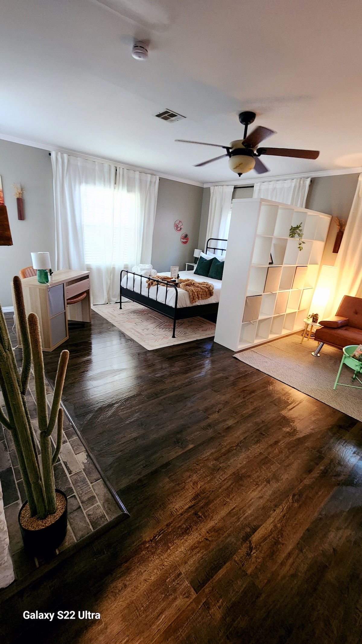 1 bedroom suite with a private entrance with access to back yard grill and patio area. Relax in the walk in shower and then rest on the queen bed. The bedroom has vaulted ceilings, a smart tv, mini fridge with separate freezer and microwave. This is a private room with a private entrance in a shared property. Once inside your private entrance there is one adjoining locked door to the main house. The door stays locked from both sides during your stay. We have taken steps to soundproof.