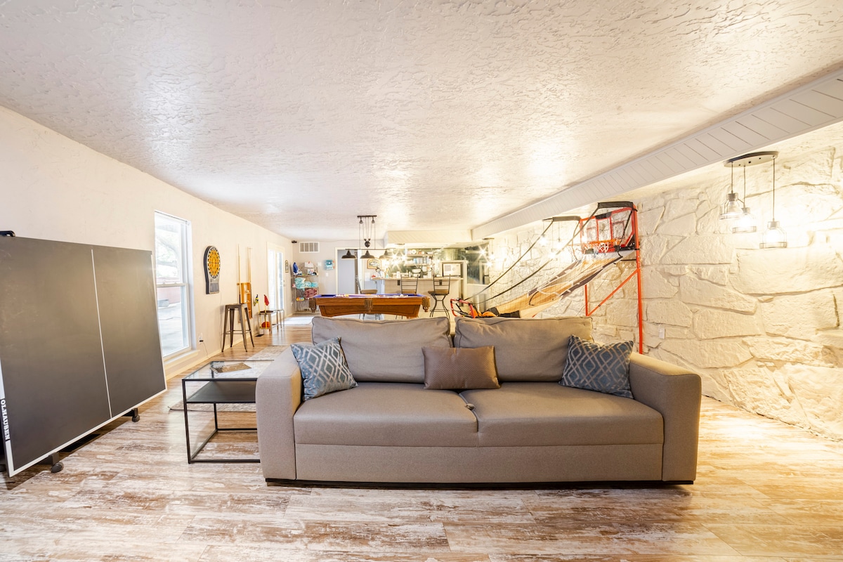 Relax in our private downstairs Mother-in-Law Suite (1,272 sq ft) with outdoor hot tub, entertainment area featuring a billiard table, 75" TV with surround sound, and equipped kitchenette. Enjoy high-speed WiFi, king Tempur-Pedic mattress, private bath, washer/dryer access, and free parking. Owner lives upstairs in separate residence—secure door ensures privacy. No parties; ideal for couples. Note: Not wheelchair accessible due to stairs. Add to wishlist: Click ❤️ above the upper right photo.