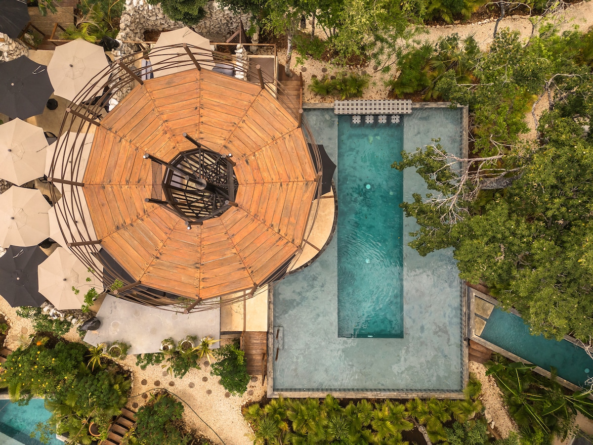 No availability? Other treehouses on Host Profile. Enjoy this unique Jungle Treehouse Experience in the tree tops. The Canopy treehouse is intentionally elevated (height: 6 Mts/20ft) and shaped amongst the trees. A spacious Eco dome gives you all the comfort of Glamping: King bed, private bathroom & HIGH SPEED fan. Relax in nature, swing the hammock enjoying the views or gaze at the stars. The property is located 10-15 MIN DRIVE from different beaches of Tulum & a short stroll to nearby cenotes.