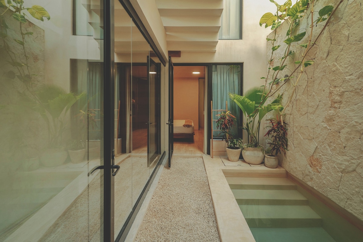 |• TEVA is built through handwork, the use of local materials, and the time required for careful construction. The spaces preserve the freshness of the handmade terrazzo floor, the texture of chukum, and the warmth of wood, creating a pleasant atmosphere from the entrance. The construction respects the pre-existing vegetation and allows the native flora to continue growing around the spaces, giving place to a natural and calm environment.
