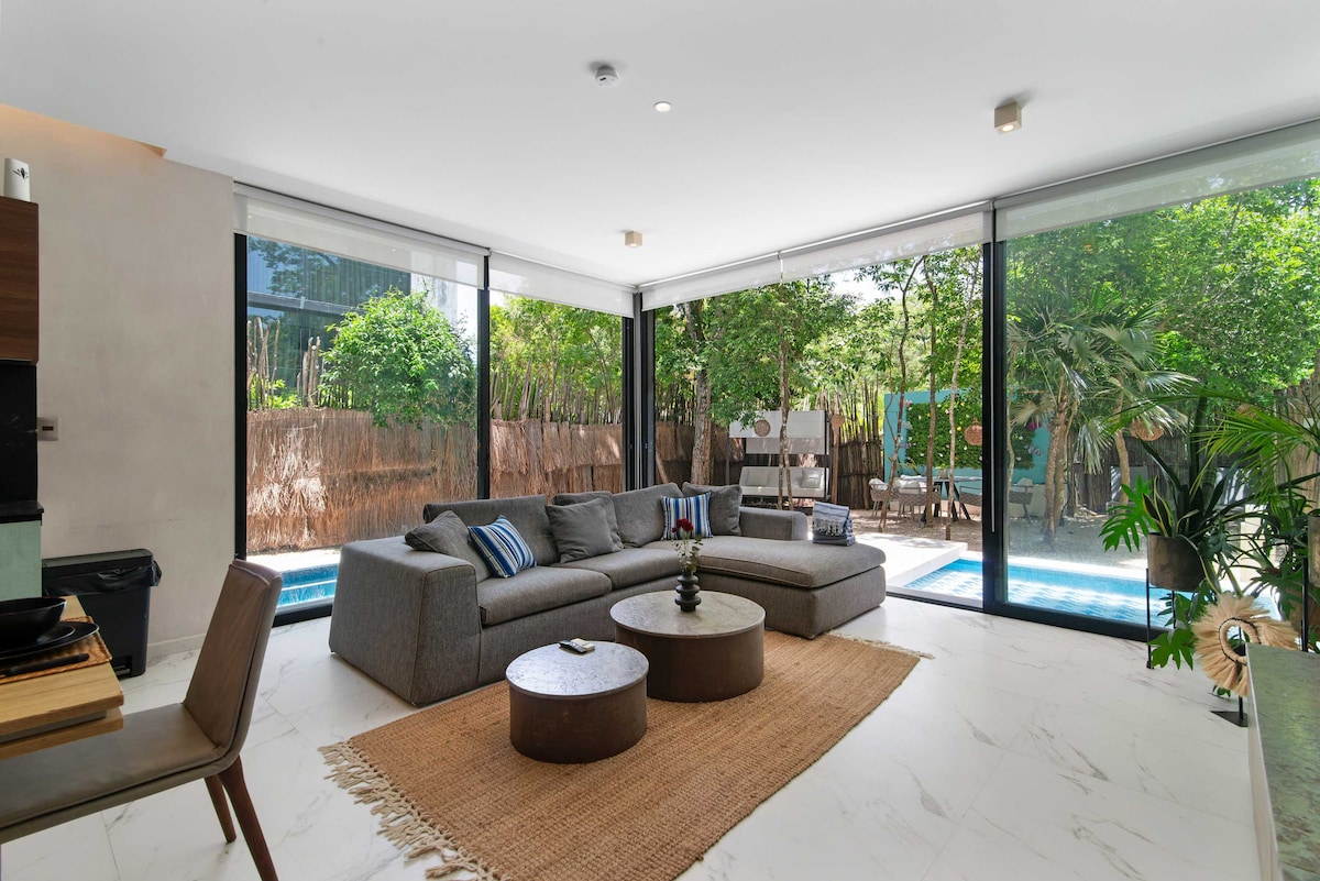 A peaceful development with jungle surroundings & a truly mystical vibe! - Private balconies with jungle views & places to sit & enjoy the outdoors anytime - Astounding amenities like gorgeous pools & 2 freshwater cenotes on site - Spectacular grounds, coworking, gym, yoga loft & 8-min to town - 2 private ground-floor patio lounges for dining, relaxing & outdoor enjoyment - Fiber Optic Wi-Fi, laptop workspace, lush views & free parking