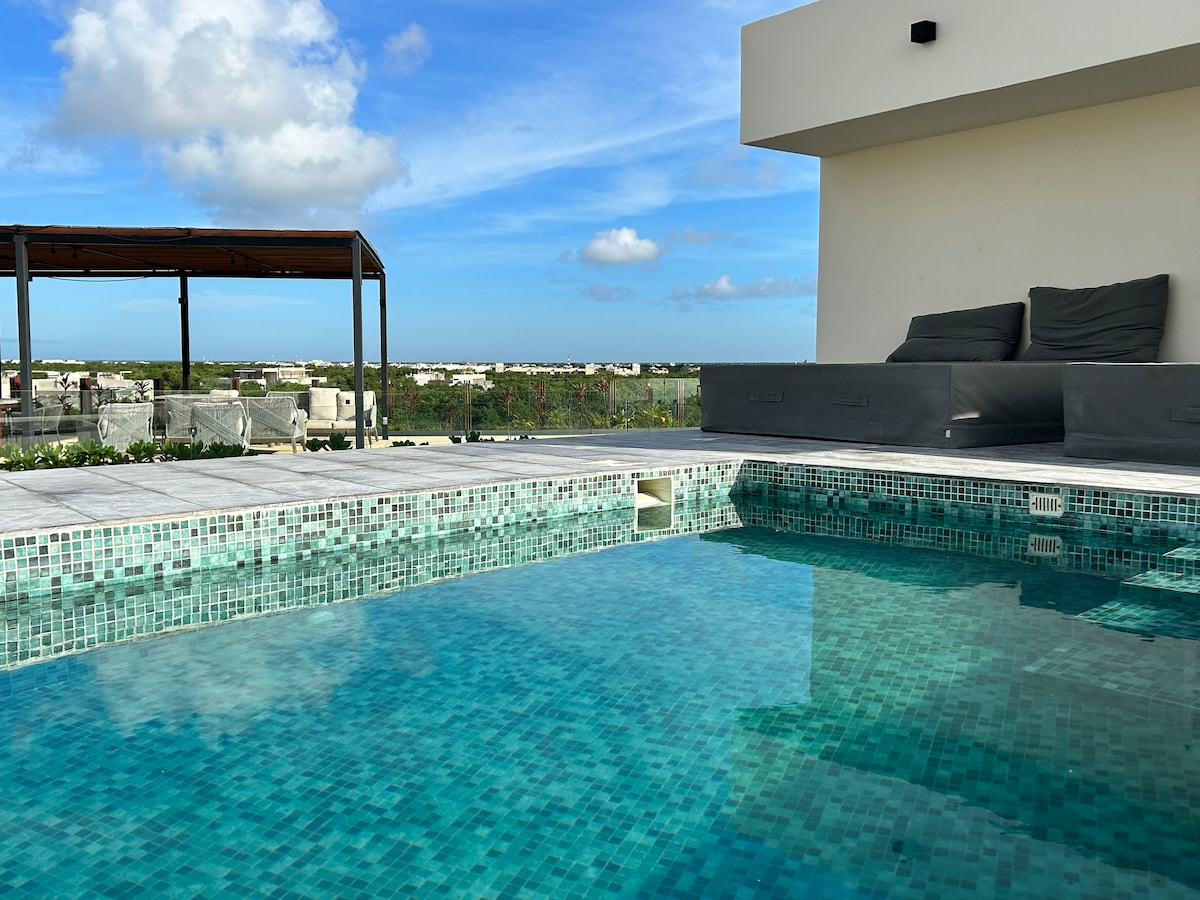 Departamento PH tipo Loft en Desarrollo de Lujo con la alberca más grande de Tulum y Gimnasio Profesional completo, ideal para estancias medianas y largo plazo ya que es el estudio más grande en el desarrollo. Home Office - Cuenta con Área de Trabajo con escritorio automático de altura ajustable, Silla Ejecutiva y Monitor. Cuenta con Planta de Tratamiento de Agua por Osmosis Inversa Gimnasio completamente equipado, con 2 secciones (cardio-box & pesas) Beach Club & Hotel Zone Shuttle