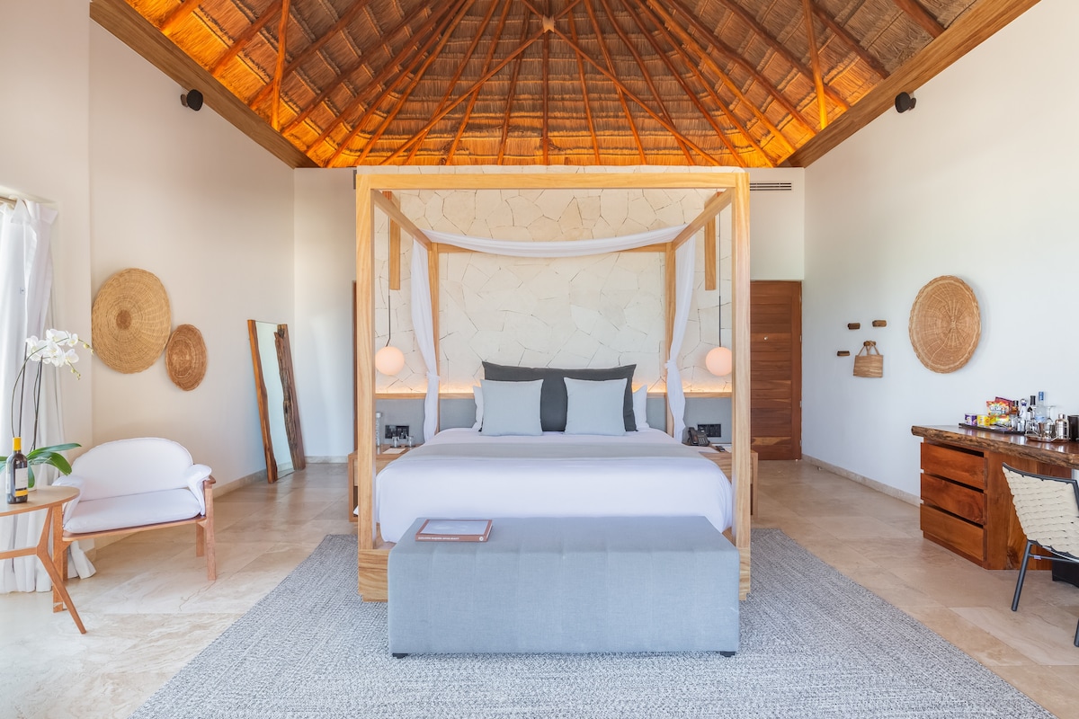Enjoy luxury in our Skyline Plunge Pool Suite, featuring a private plunge pool and beautiful views. Each suite includes a comfortable king-size bed, safe, bathtub, rain shower, minibar, air conditioning, ceiling fan, and a small kitchenette. As a guest, you’ll have exclusive access to our weekly wellness program and a private cenote, perfect for unwinding. Additionally, you can enjoy our pool, terrace, restaurant, and bar, making your stay a unique experience.