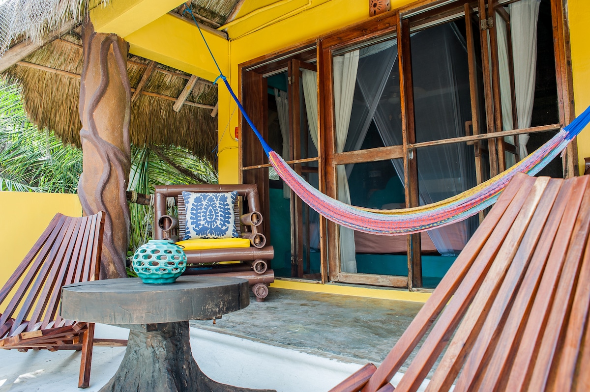 Disfruta de la sencillez de este alojamiento tranquilo y céntrico. Es un cabaña centrica en el pueblo de tulum, con la central de autobuses a 4 calles, es una bonita cabaña con una ubicación estratégica para estar cerca a la playa y los restaurantes y bares del centro, Cuenta con un deck y árbol muy grande al frente ideal para salir a tomar el aire natural y rodeado de muchas plantas.