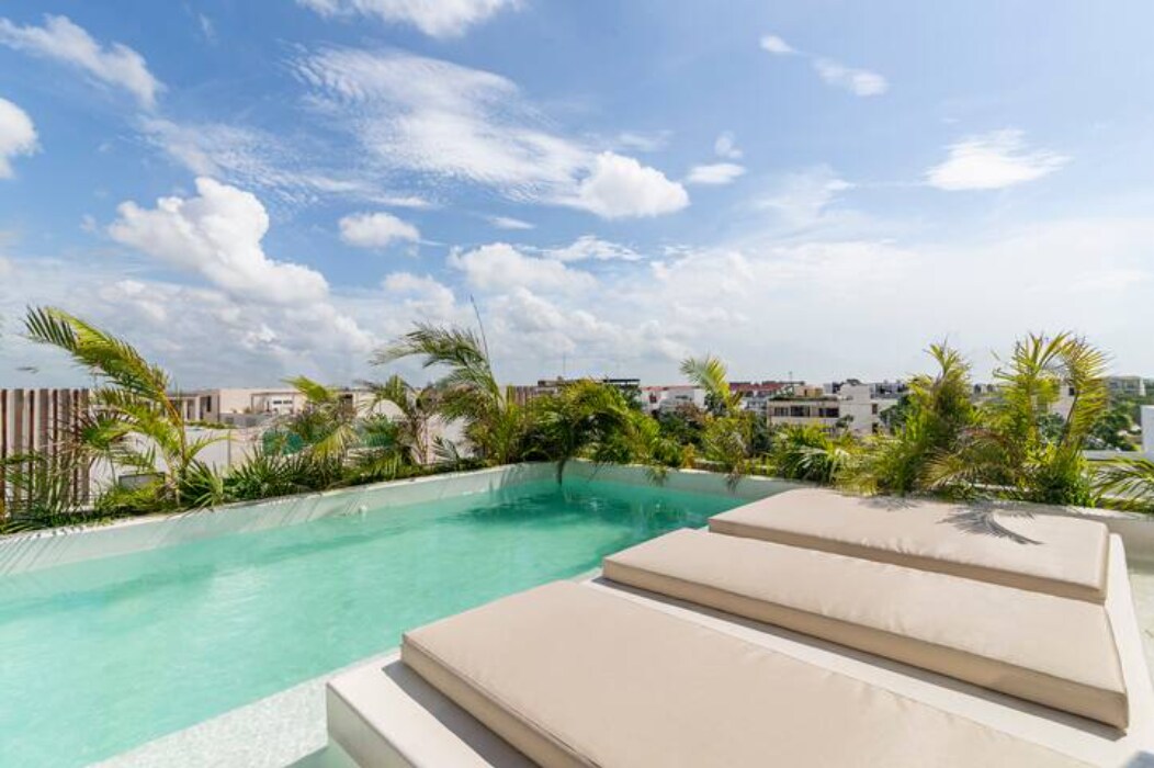 Escape to your private Tulum oasis! 🏝️ This luxurious penthouse boasts a spacious bedroom and expansive terrace with a private pool perfect for soaking up the sun and enjoying refreshing dips. 🏊♀️ Lounge on comfortable sunbeds, sip cocktails, and savor the warm tropical breeze. Located moments from the beach, it's your gateway to unforgettable Tulum adventures. ✨ ✨ Book your stay today and experience paradise ! 🤩
