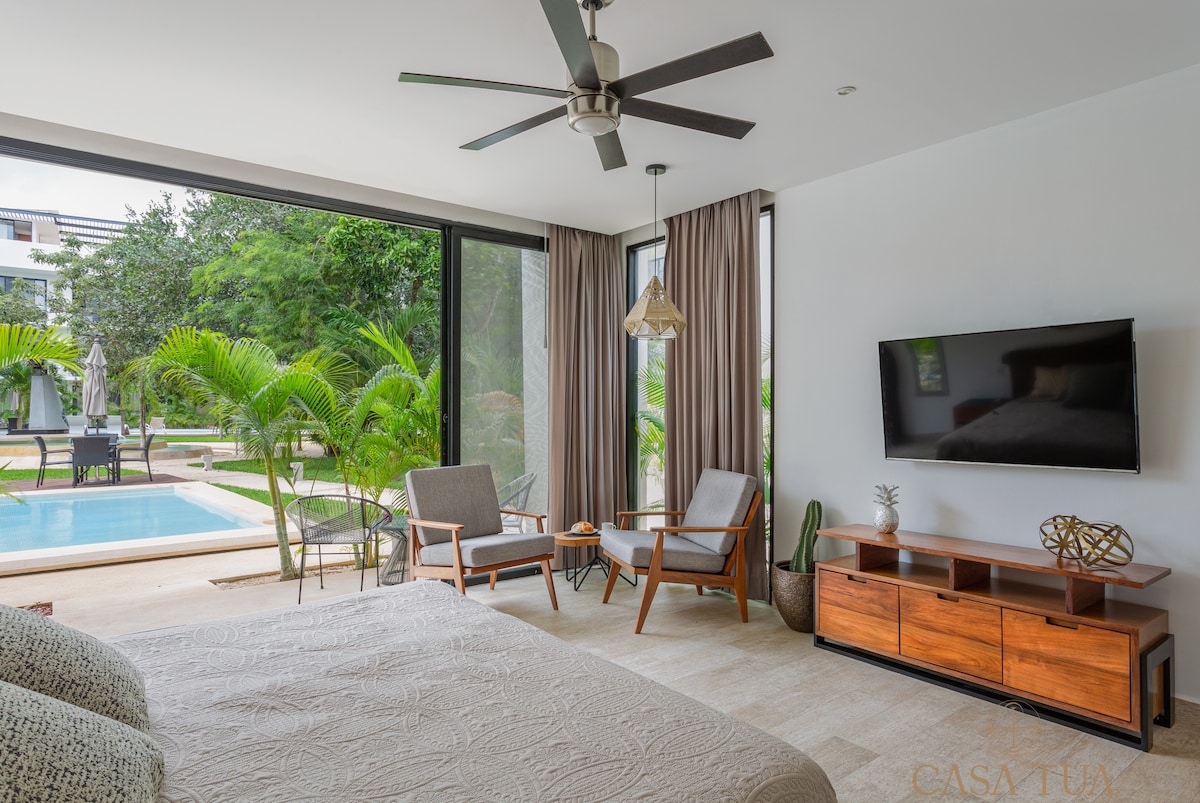 Wake up in this bright suite at Central Park Tulum and step through floor-to-ceiling glass doors to plan your day in a resort-style setting. Enjoy modern amenities, a shared gym, and access to two pools for relaxation. 🚲 Two free bikes are available for your use ✈️ Only 30 minutes from the new Airport. 💪 Gym$ (discounted for guests) Spa$ (one free access for short term stays and two for long term)
