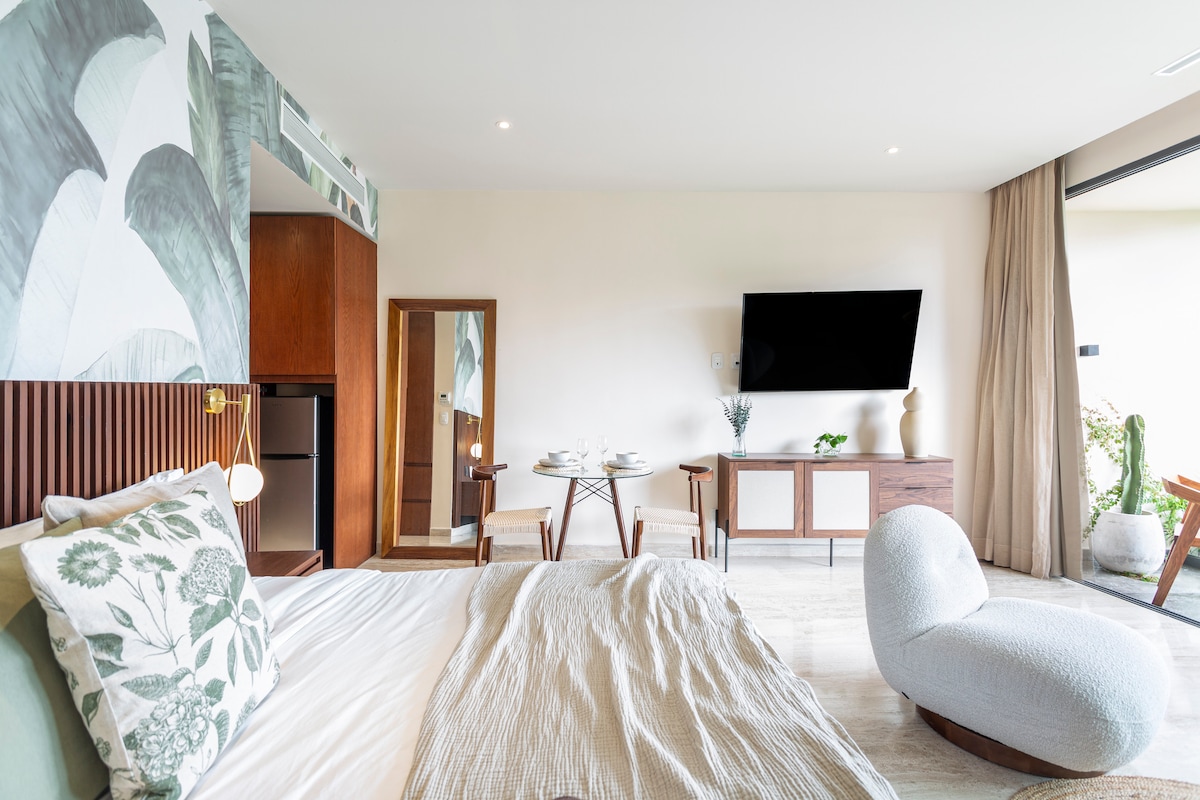 Rodéate de estilo en este destacado espacio, nuestra habitación cuenta con una cama king size con aire acondicionado, WiFi gratuito, pantalla plana, amplio baño con regadera de lluvia, articulos de aseo gratuitos, secador de pelo, incluye nevera y cafetera. Acceso directo a la piscina.