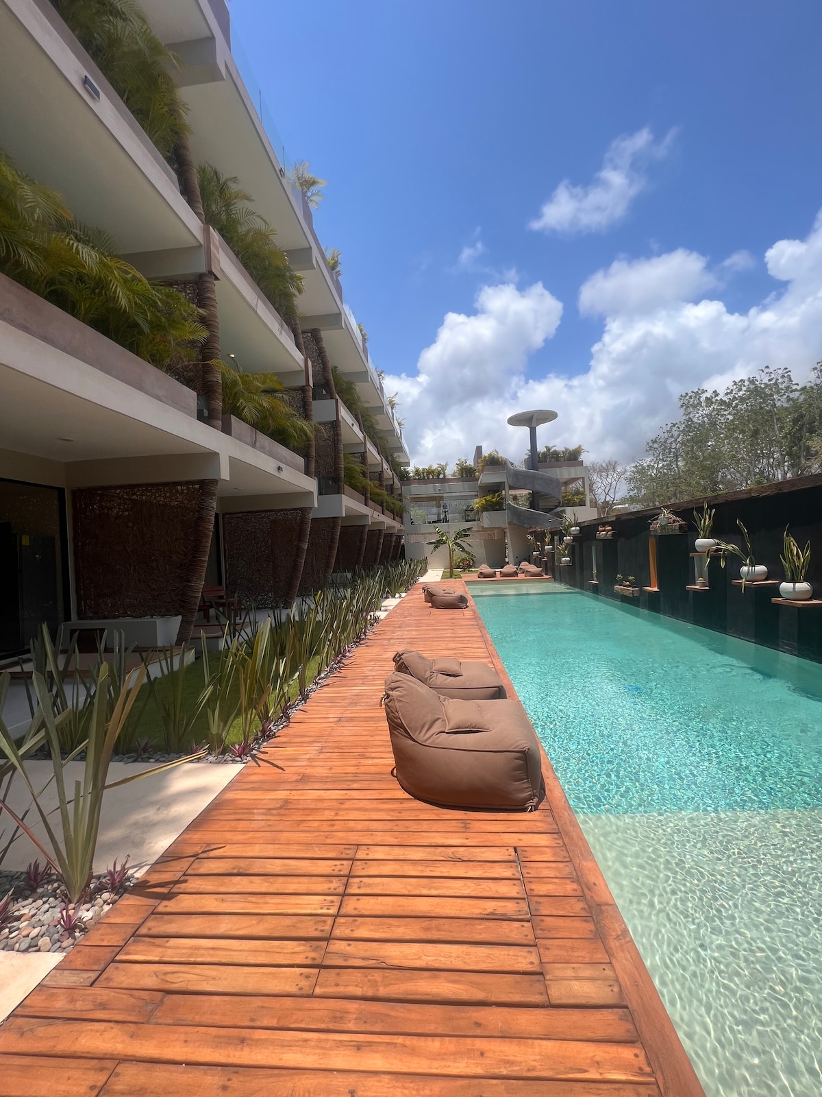 Unveil contemporary luxury at our new jungle condo. With expansive windows and double-height ceilings,this unit is bathed in natural light, creating a unique and inviting atmosphere.Relax in the king-size bed overlooking the social area or step outside to your private swim-up pool.Take the elevator to Tulum's #1 rooftop terrace for stunning views.Enjoy 200 mb internet and a central location between downtown Tulum and the beach,ideal for exploring shops, dining, and the beautiful beaches of Tulum