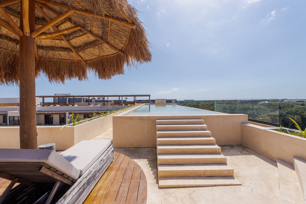 Stunning loft apartment with direct access to pools, near Tulum center and only a few minutes from the spectacular beach and Tulum beach clubs. Enjoy several stunning swimming pools, a roof top pool, sun beds, nice gym, 24/7 staff, strong A/C, elevator, fast Wifi (400 Mbps), blackout curtains, 55" smart TV, a fully equipped kitchen and private parking. Experience outdoor dining or just drinks with beautiful panoramic views at the roof top restaurant