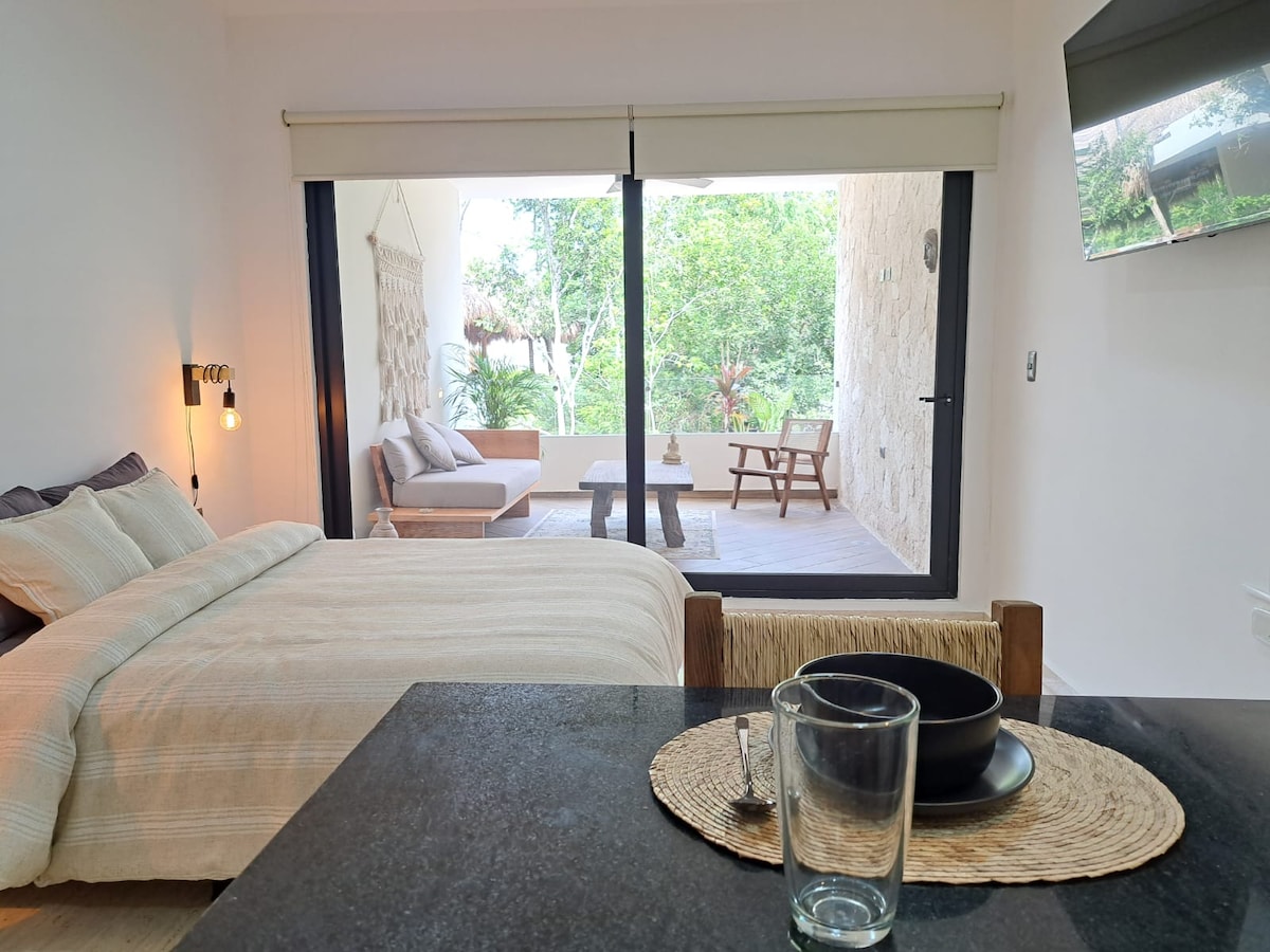 This studio apartment is suitable for our guests to enjoy a local experience in downtown Tulum and at the same time be just minutes away from its magical beaches and everything Tulum hotel zone offers. We think about every detail to satisfy the needs of all types of travelers. Whether you come on vacation or/and work our place is for you. It is located in Menesses Tulum, a place where you will find gym, cinema room, relaxation area, pools and more.