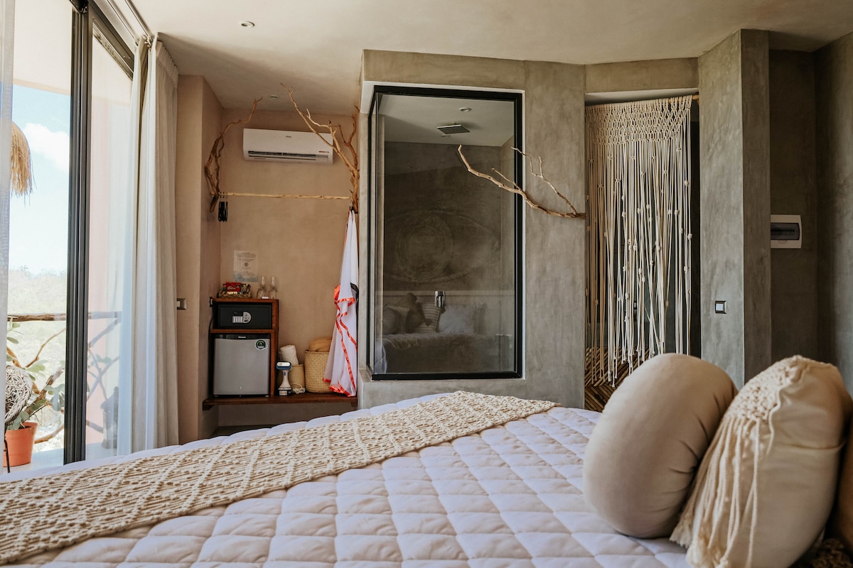 Ubicado a unos pasos de la Av principal de Tulum. La habitación se encuentra en el Hotel Casa Sofía, rodeado de tiendas y restaurantes. El Hotel cuenta con 10 habitaciones privadas y con todo lo necesario para su comodidad: Aire Acondicionado, Baño privado, Agua Fría y Caliente, Minibar, Mesa de trabajo, etc.