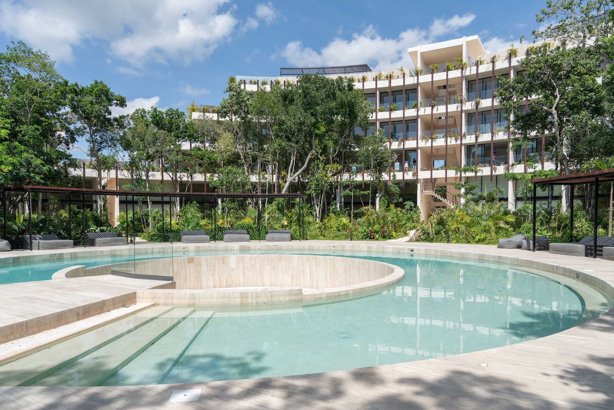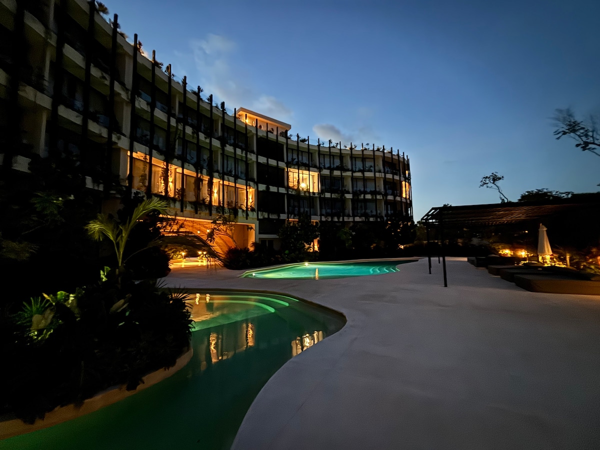 Stunning loft apartment with direct access to pools, near Tulum center and only a few minutes from the spectacular beach and Tulum beach clubs. Enjoy several stunning swimming pools, a roof top pool, sun beds, nice gym, 24/7 staff, strong A/C, elevator, fast Wifi (400 Mbps), blackout curtains, 55" smart TV, a fully equipped kitchen and private parking. Experience outdoor dining or just drinks with beautiful panoramic views at the roof top restaurant
