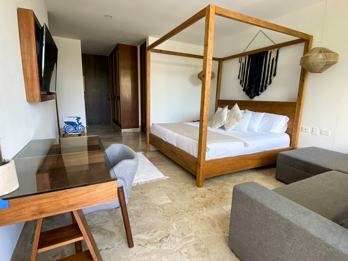 INCREIBLE LOFT DE 1 RECÁMARA CON DOBLE ALTURA Y ACCESO DIRECTO A LA ALBERCA. ✅Incluye 2 Bicicletas y Scooter ( checa condiciones ) ✅ATV’s (renta) Vive la experiencia Tulum en un espacio de diseño eco-friendly, rodeado de jardines y con acceso directo a la alberca principal desde tu balcón. Ubicado en una de las zonas más seguras y privilegiadas de Tulum, con amenidades inigualables, incluyendo un cenote natural, gimnasio totalmente equipado y un Rooftop Espectacular con Infinitypool.