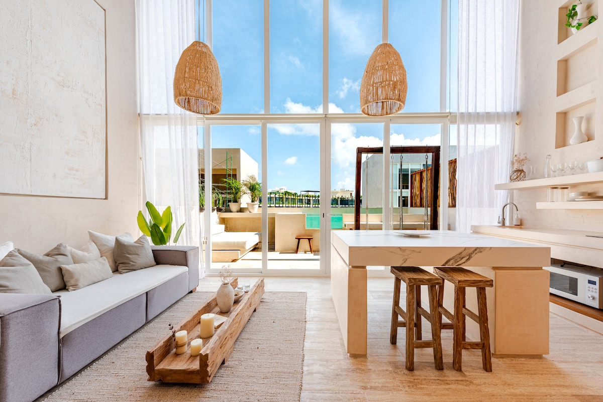 Stunning loft apartment with direct access to pools, near Tulum center and only a few minutes from the spectacular beach and Tulum beach clubs. Enjoy several stunning swimming pools, a roof top pool, sun beds, nice gym, 24/7 staff, strong A/C, elevator, fast Wifi (400 Mbps), blackout curtains, 55" smart TV, a fully equipped kitchen and private parking. Experience outdoor dining or just drinks with beautiful panoramic views at the roof top restaurant