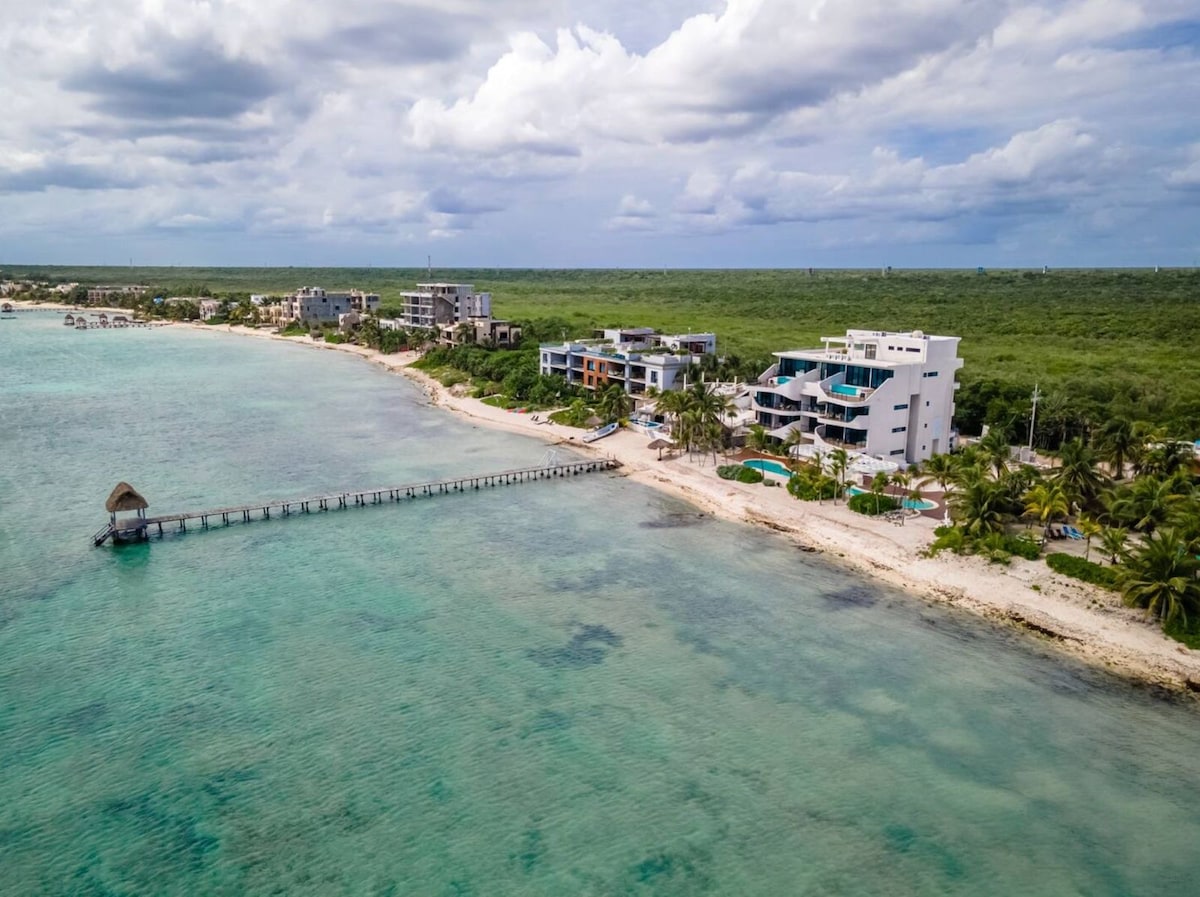 Amplio y tranquilo apartamento de lujo frente al mar para 6 adultos. -1 habitación con balcón y vista al mar: 1 cama king size, 1 baño y TV. -1 habitación con vista a la selva: 2 camas Queen size, 1 baño. *Sala con TV, comedor y cocina equipada *Lavandería El acceso a la piscina es de uso compartido y gratuito. -A 1 min del Cenote Tankah en donde podrás practicar snorkel. -A 10 min del Cenote Manatí A 30 min del centro de Tulum -A 40 min de Chedraui -A 45 min del Aeropuerto de Tulum