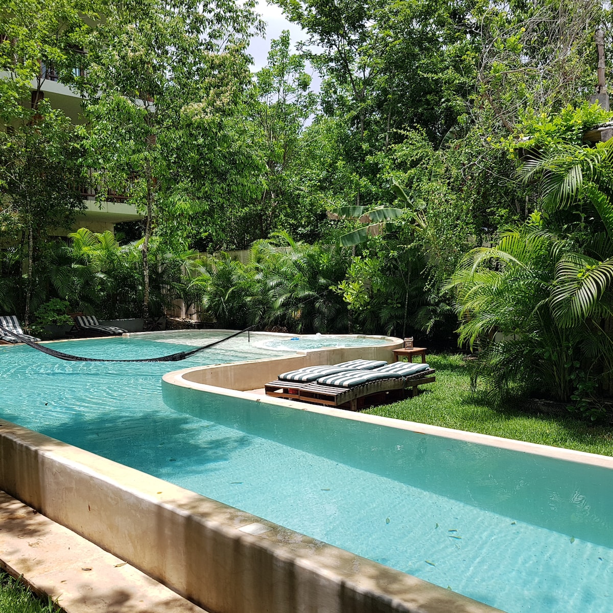 Charming & private 1BR apartment in Tulum ♡ • Top Rated On-site restaurant Aroma Cafe Tulum • Cenote-style pool with massage jets • Self check-in after 3:00 pm • Check out: 11:00am • 1,000 Mbps Fiber Internet • Full A/C • 1 King-size bed + 2 single bed "sofa beds" • 42" 4K Smart TV with satellite & Netflix • Private en-suite bathroom • Fully equipped kitchen + dining area • Free private parking • Outdoor grill • Exclusively for 2 adults & 2 children