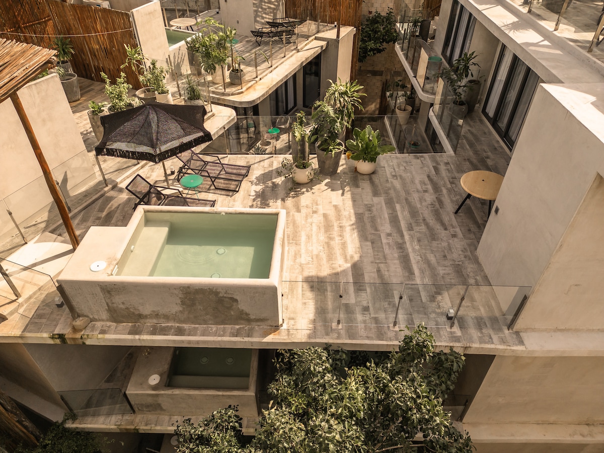 ✨ Satori – Modern Tulum Apartment with Private Plunge Pool ✨ Relax in your private plunge pool inside the apartment or enjoy the shared pool and rooftop pool with stunning views. King bed, sofa bed, fast WiFi, two Smart TVs, fully equipped kitchen, washer/dryer, and free parking included. Just 6 min from downtown and 3.5 km from the Hotel Zone, perfect for vacation, romantic getaways, or remote work. Unplug, reconnect, and soak in the magic of Tulum!